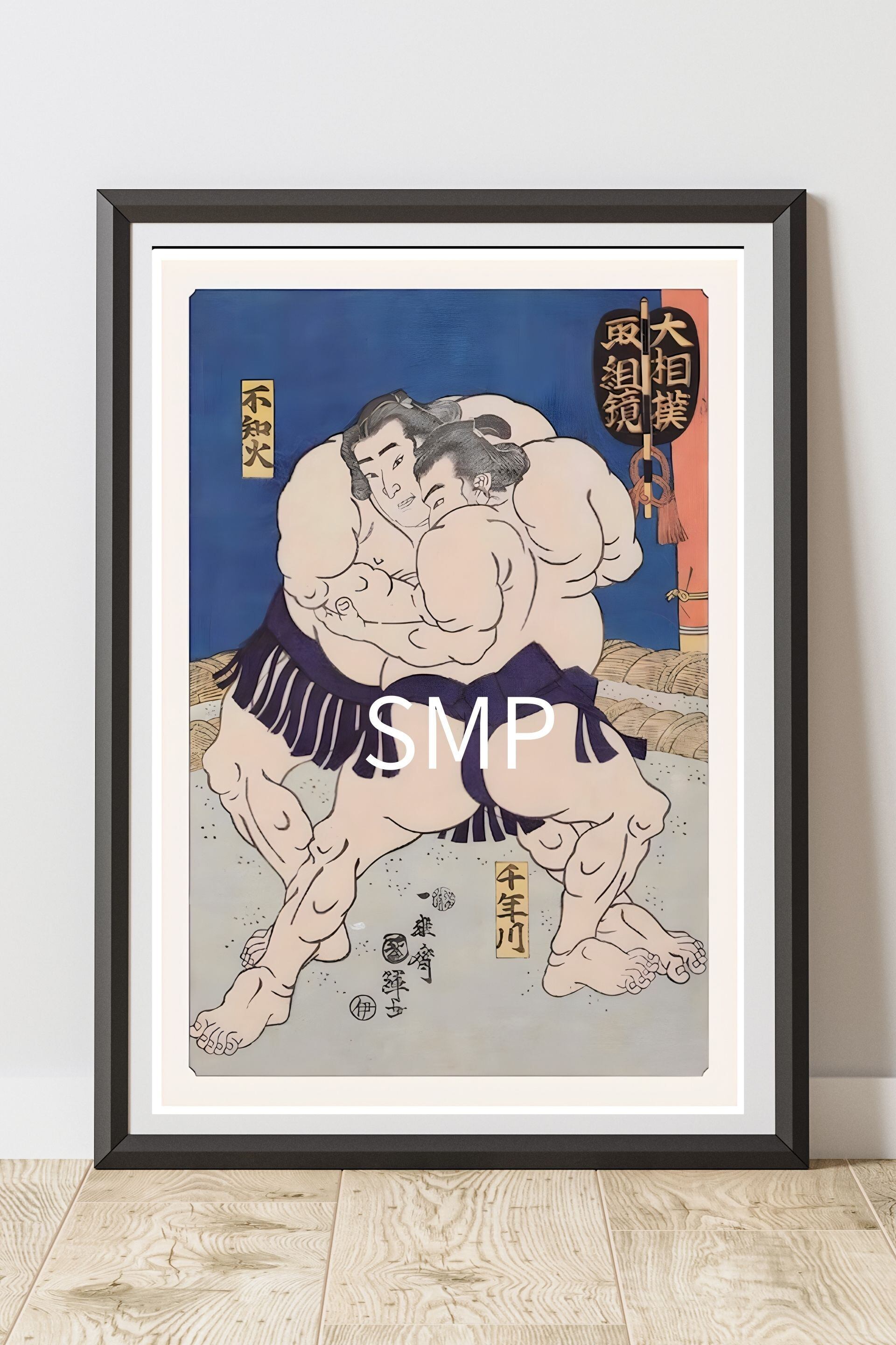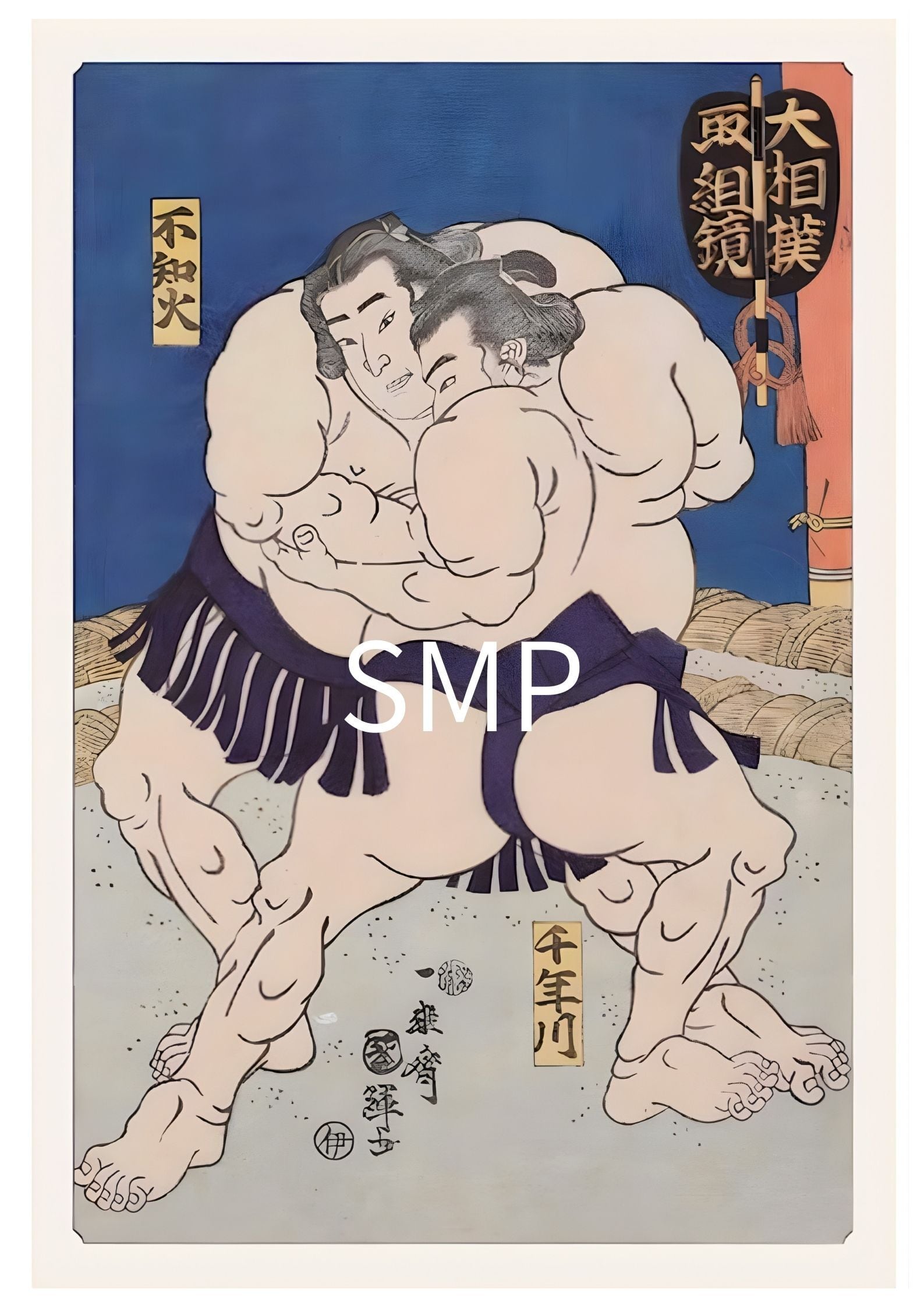 浮世絵師 二代国輝 による「大相撲取組鏡 不知火×千年川」をモチーフに、ヴィンテージ調アートポスターとして再現しました。