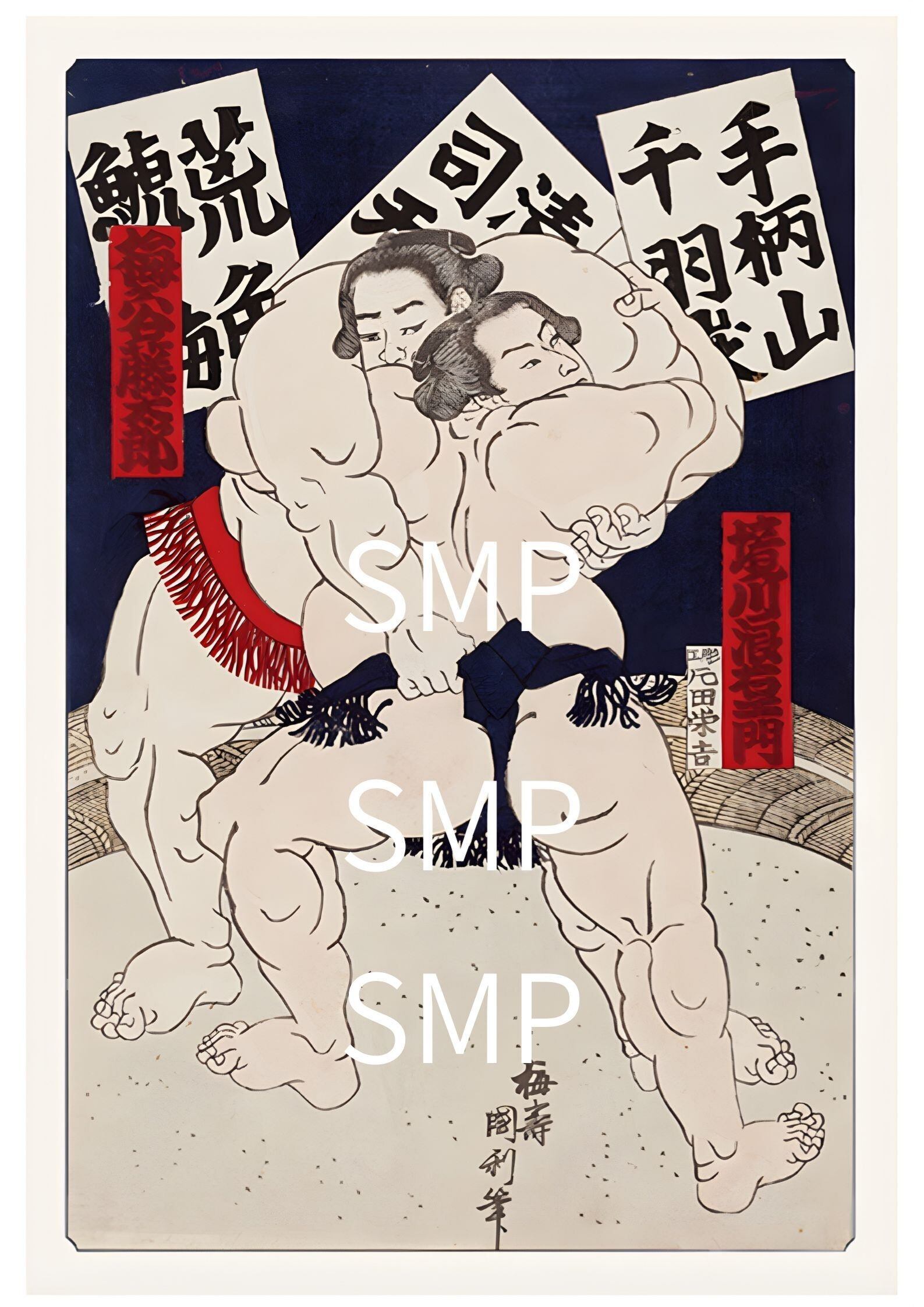 浮世絵 相撲取組図|境川浪右衛門×梅ヶ谷藤太郎 A2ヴィンテージアートポスター(国利画) 匿名配送