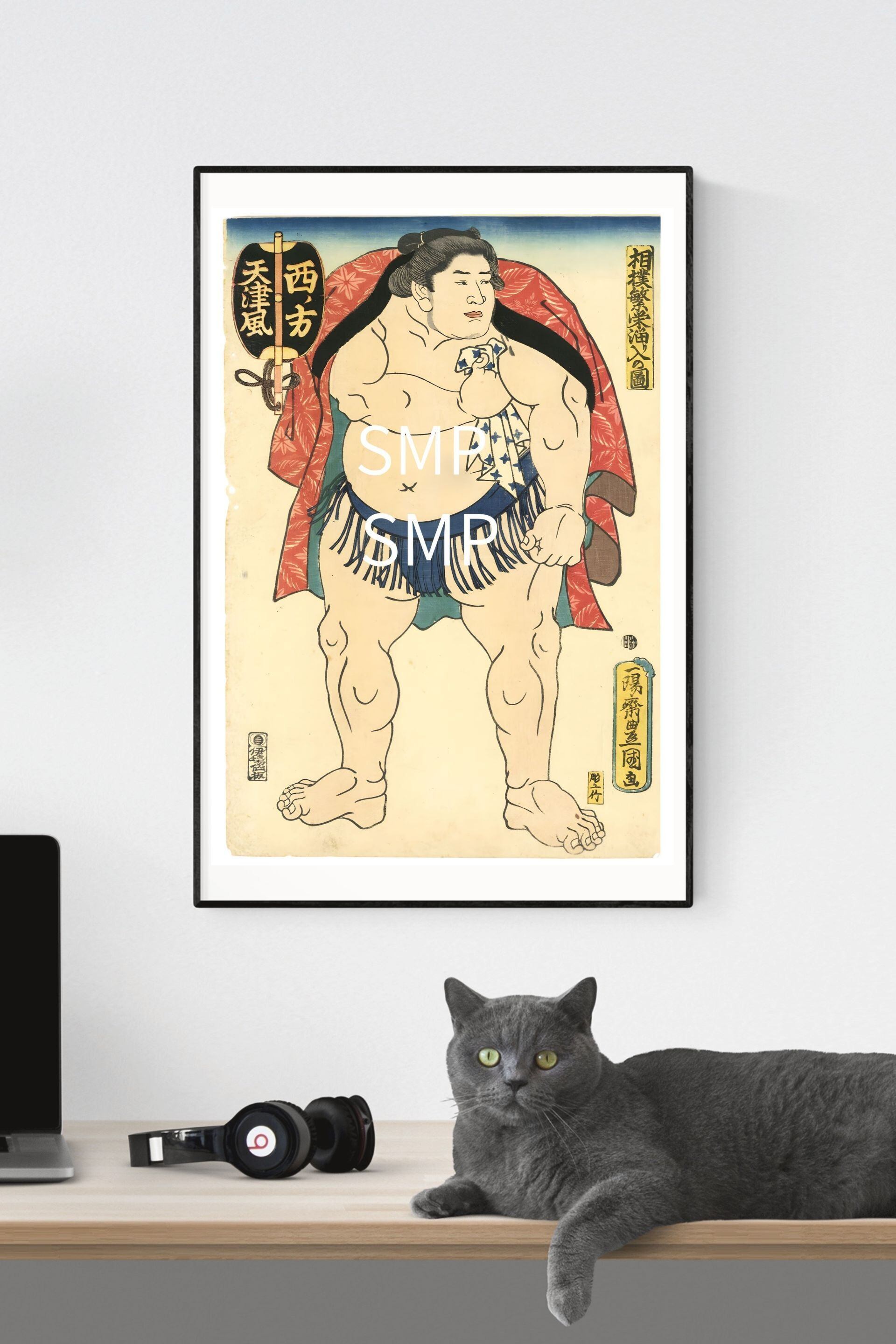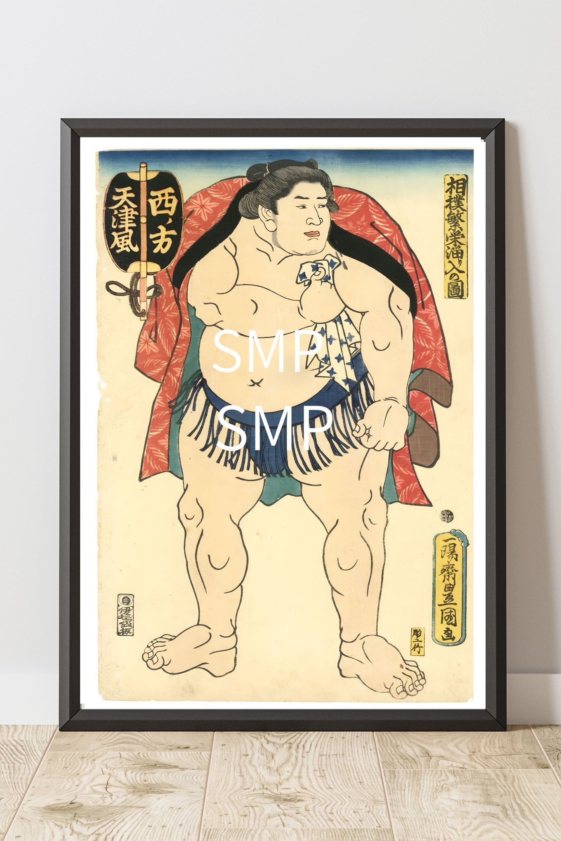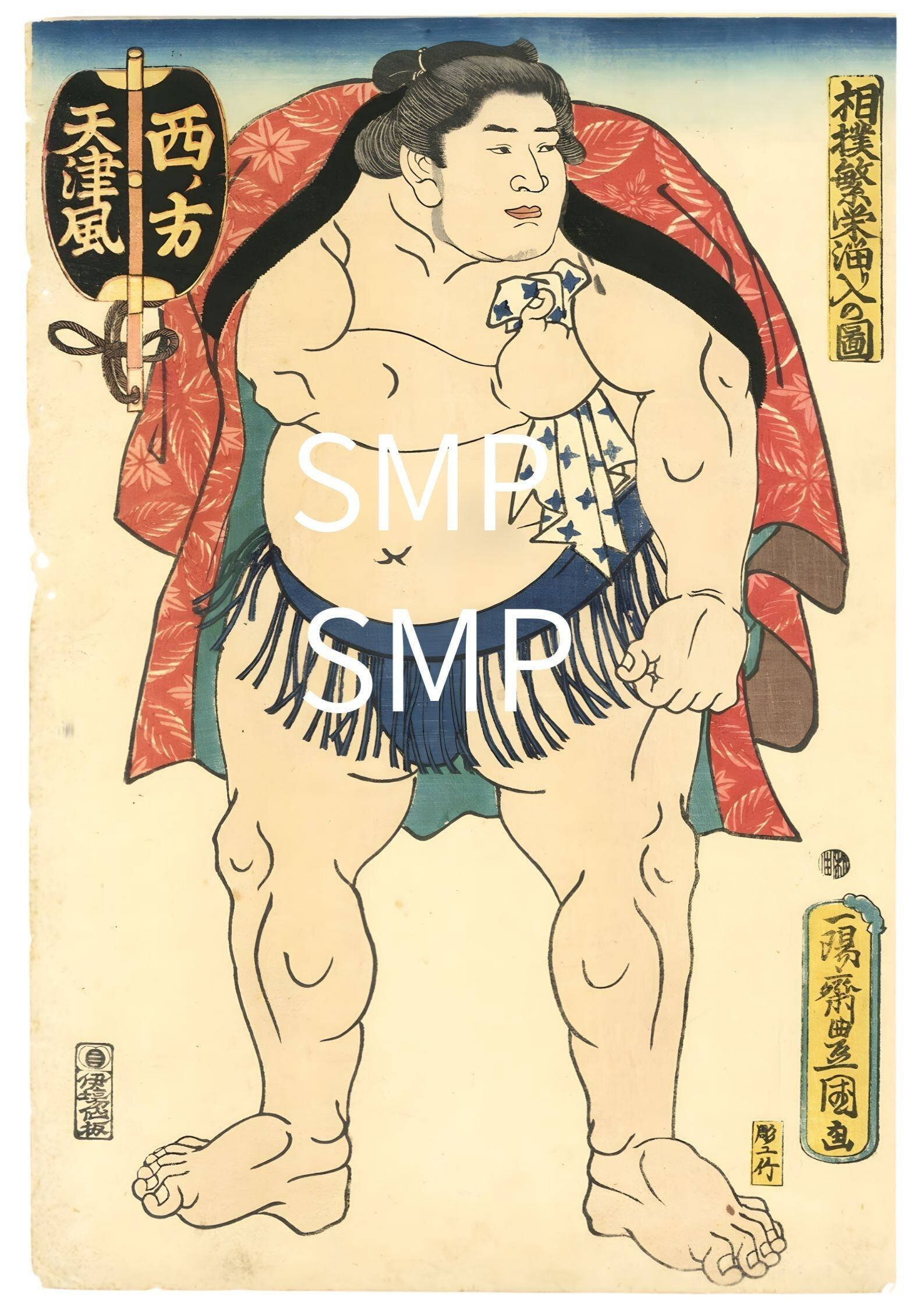 一陽齋豊国 相撲絵ポスター|『相撲繁栄溜り入の図 西ノ方天津風』浮世絵模写レプリカ A2ヴィンテージ和風インテリア