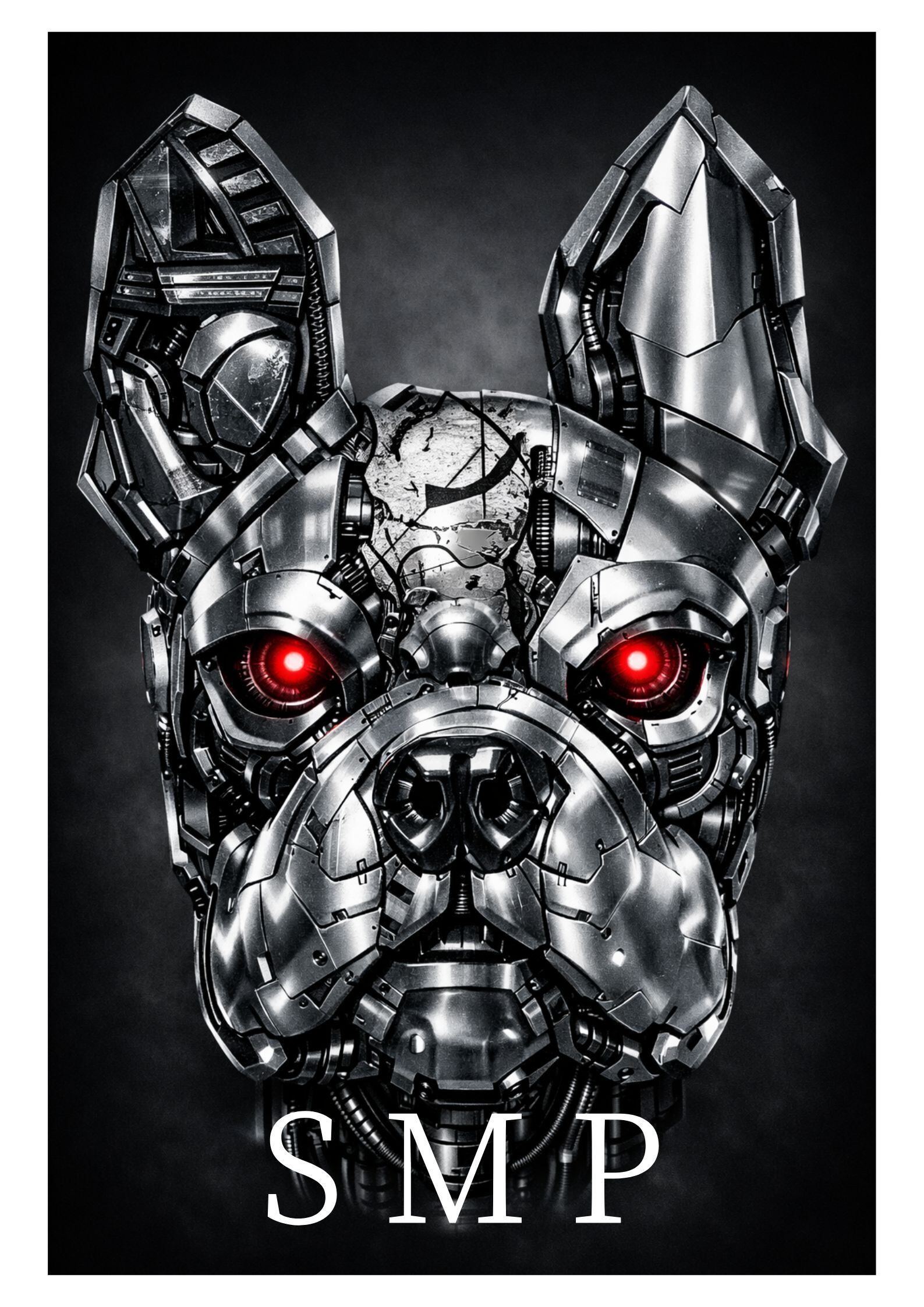 鋼鉄のメカニカル構造で描かれたサイボーグ・フレンチブルドッグ。