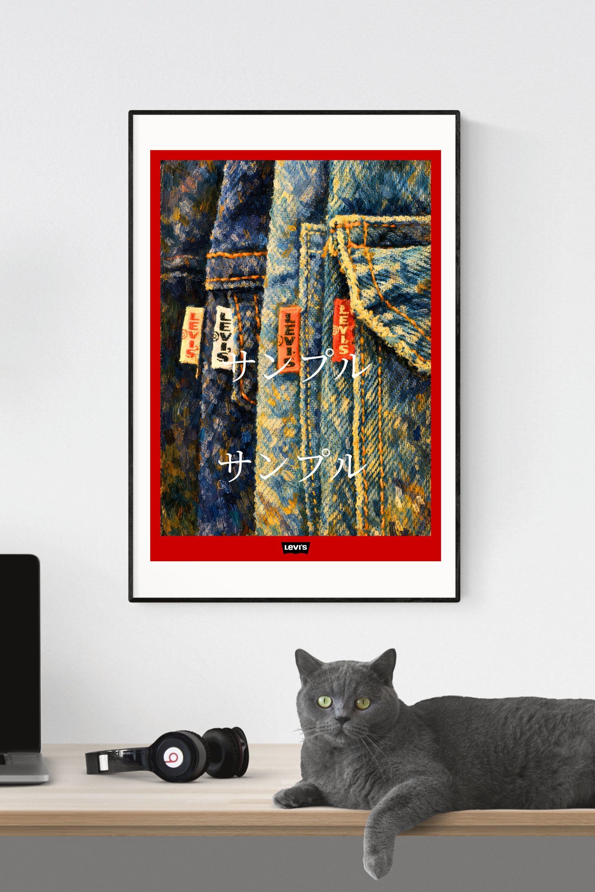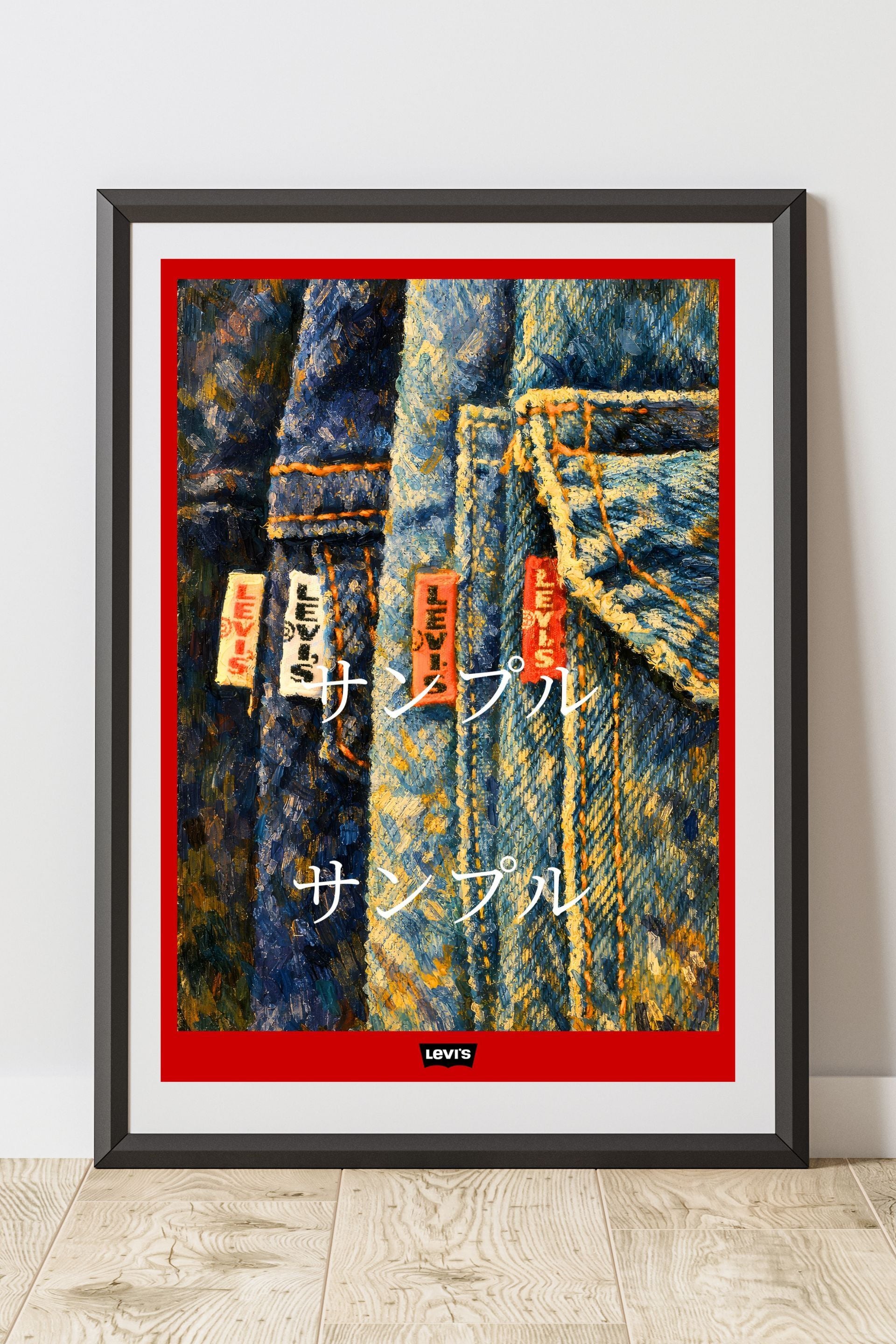 LEVI’S デニム アートポスター A2サイズ ヴィンテージジーンズ 油彩風アート Levi's ジーンズタグ インテリアポスター カフェ バー 音楽スタジオ