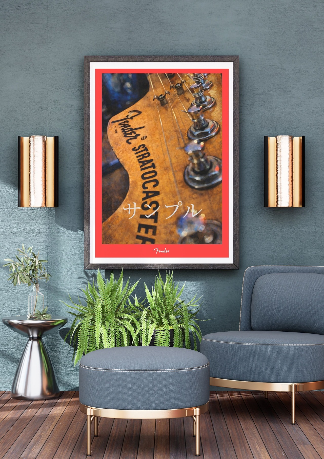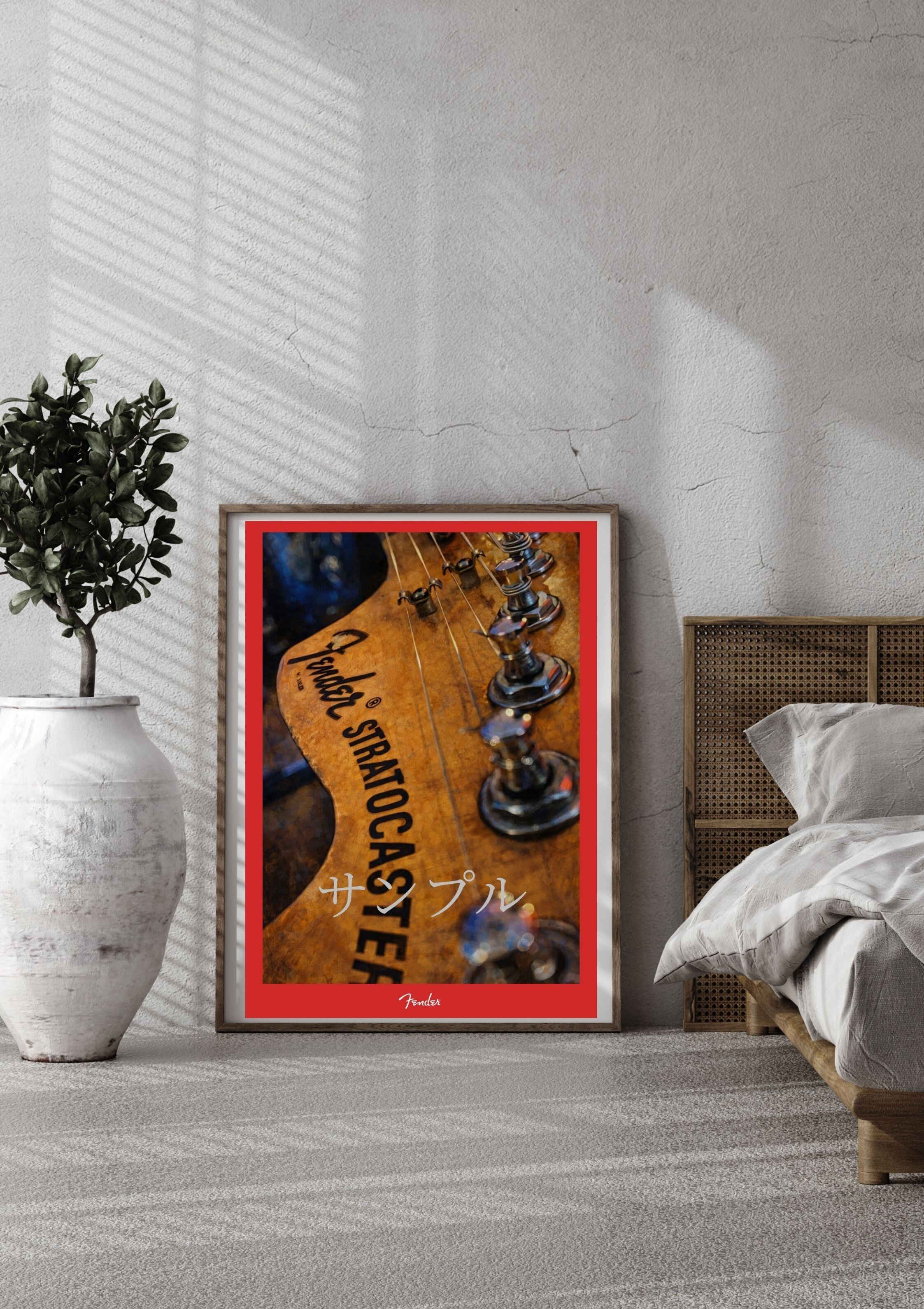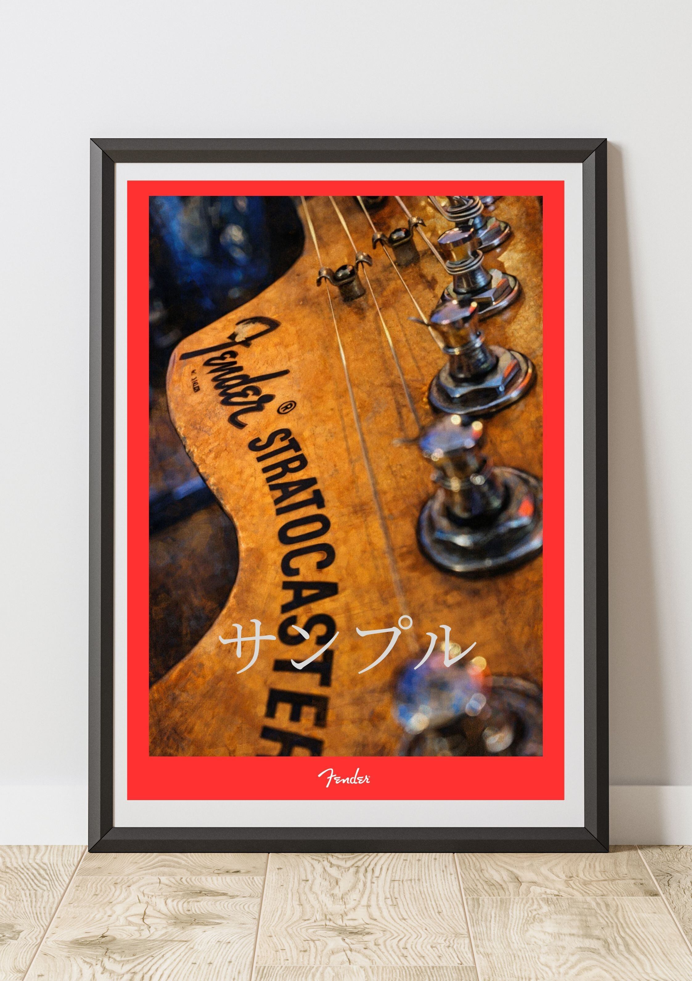 Fender Stratocasterのヘッドストックを大胆に切り取ったヴィンテージギターアートポスターです。