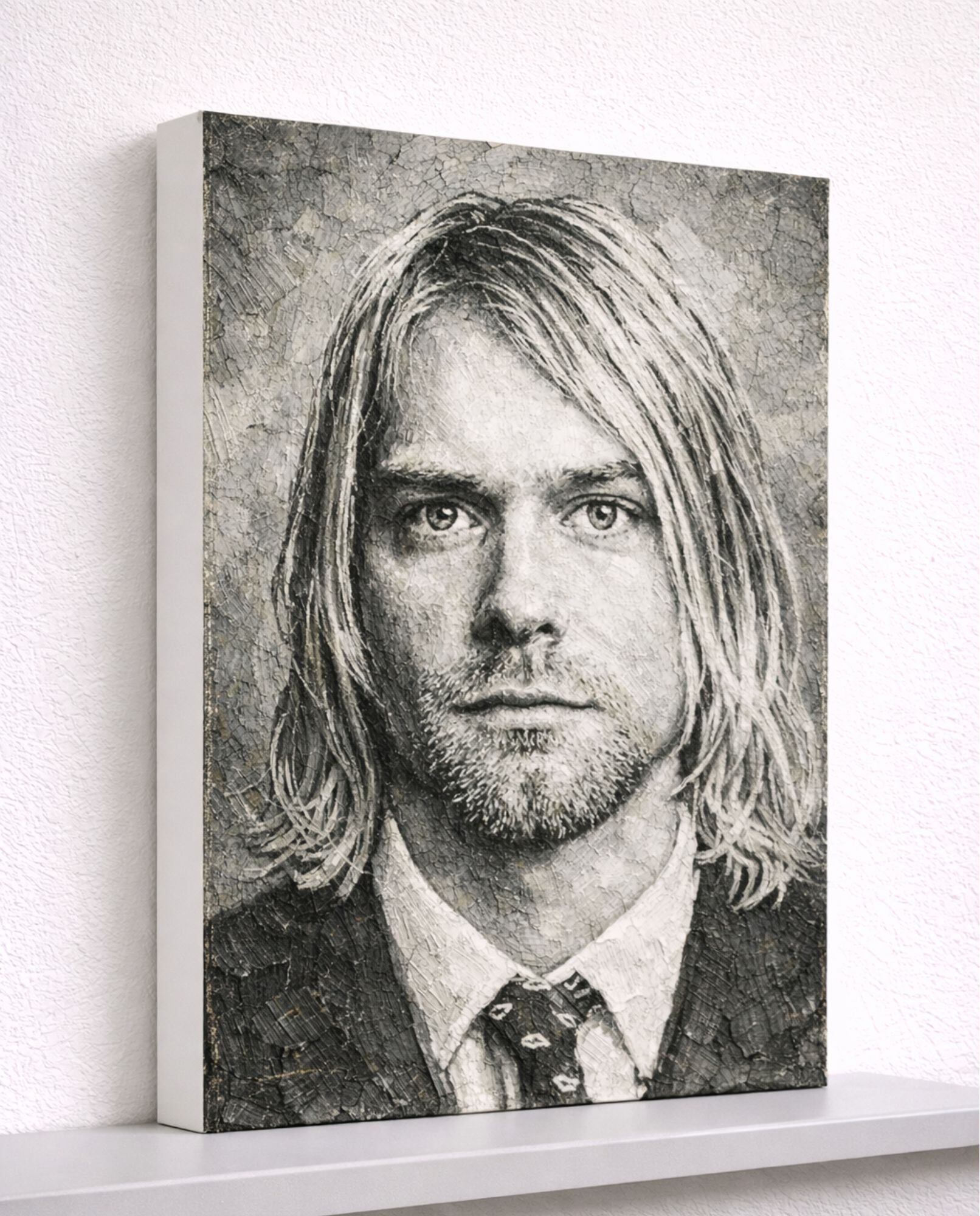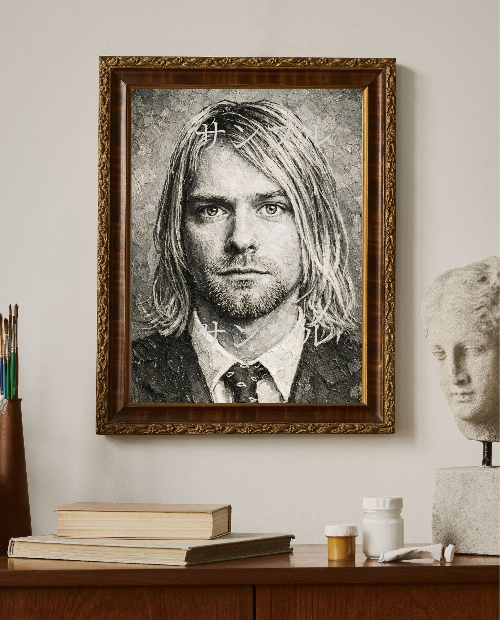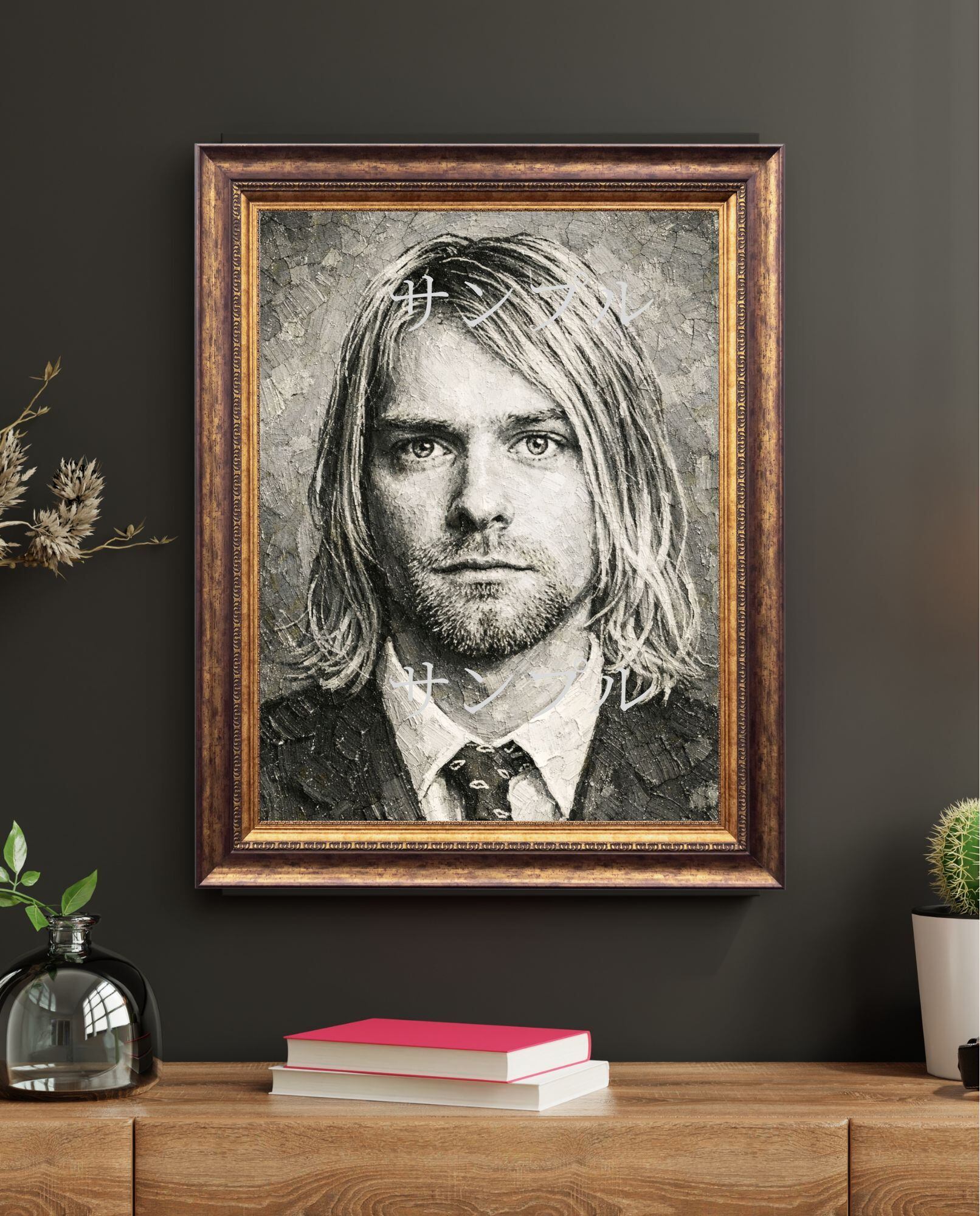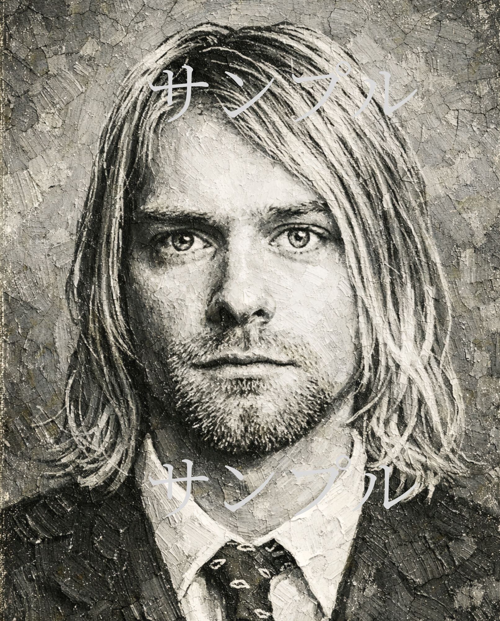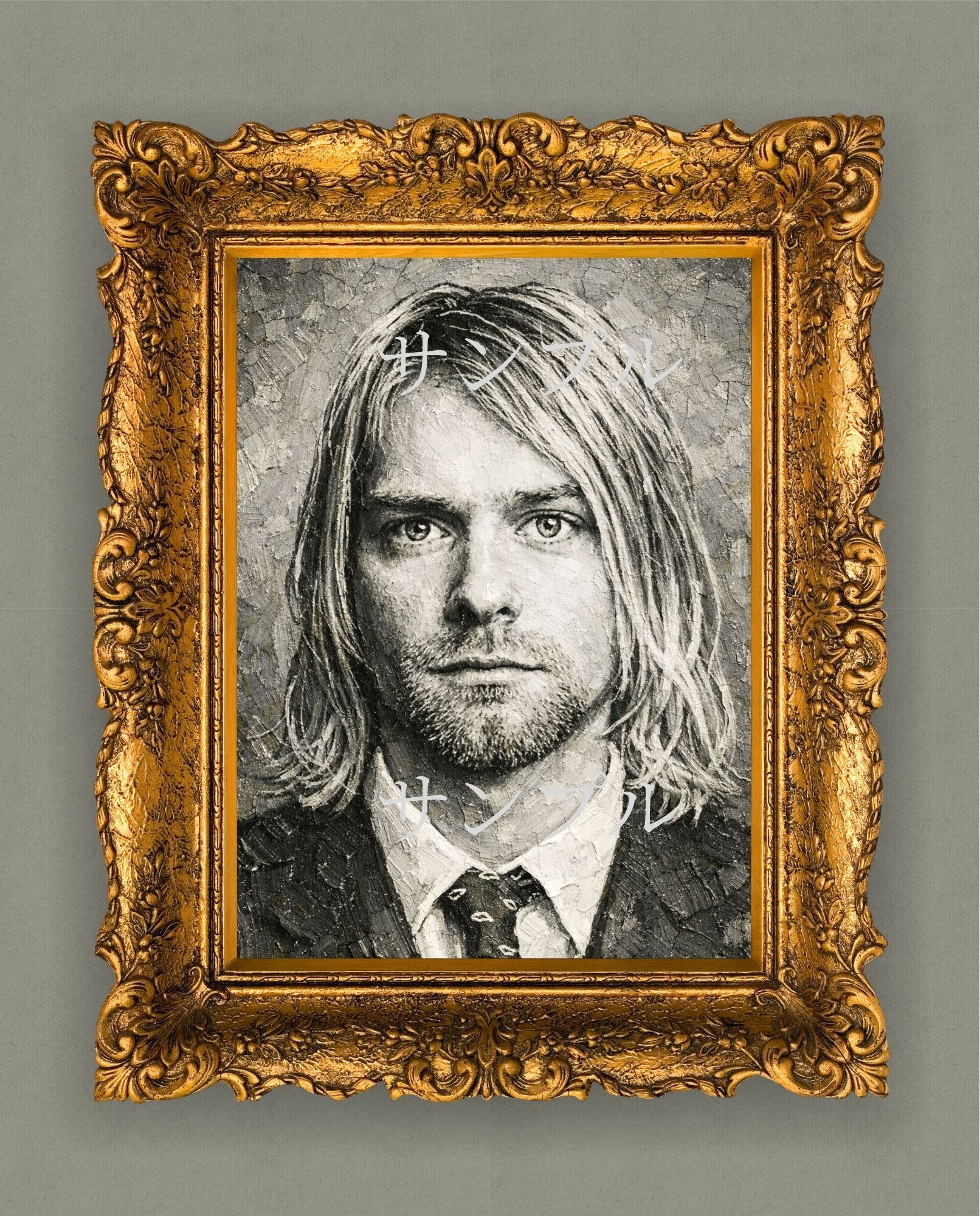 グランジロックのカリスマ性を象徴する存在感を、重厚なモノクロ油絵風で表現しています。