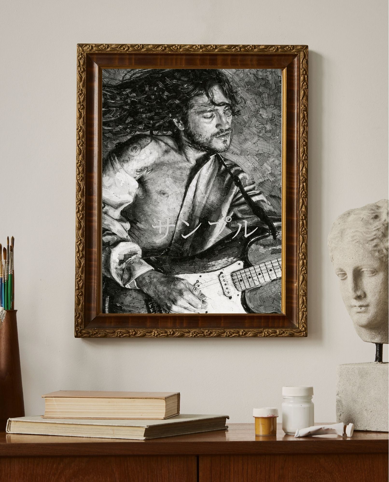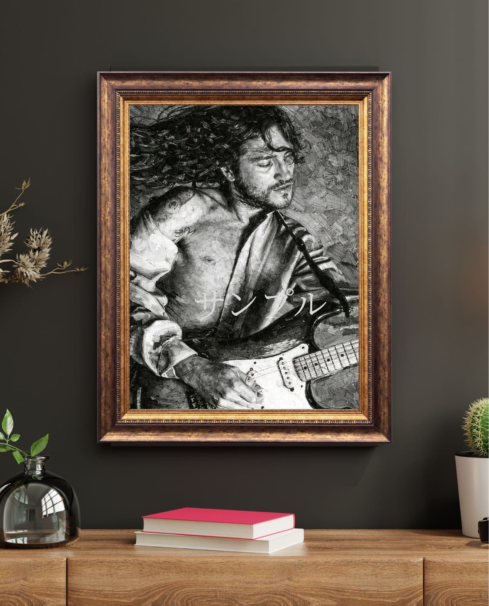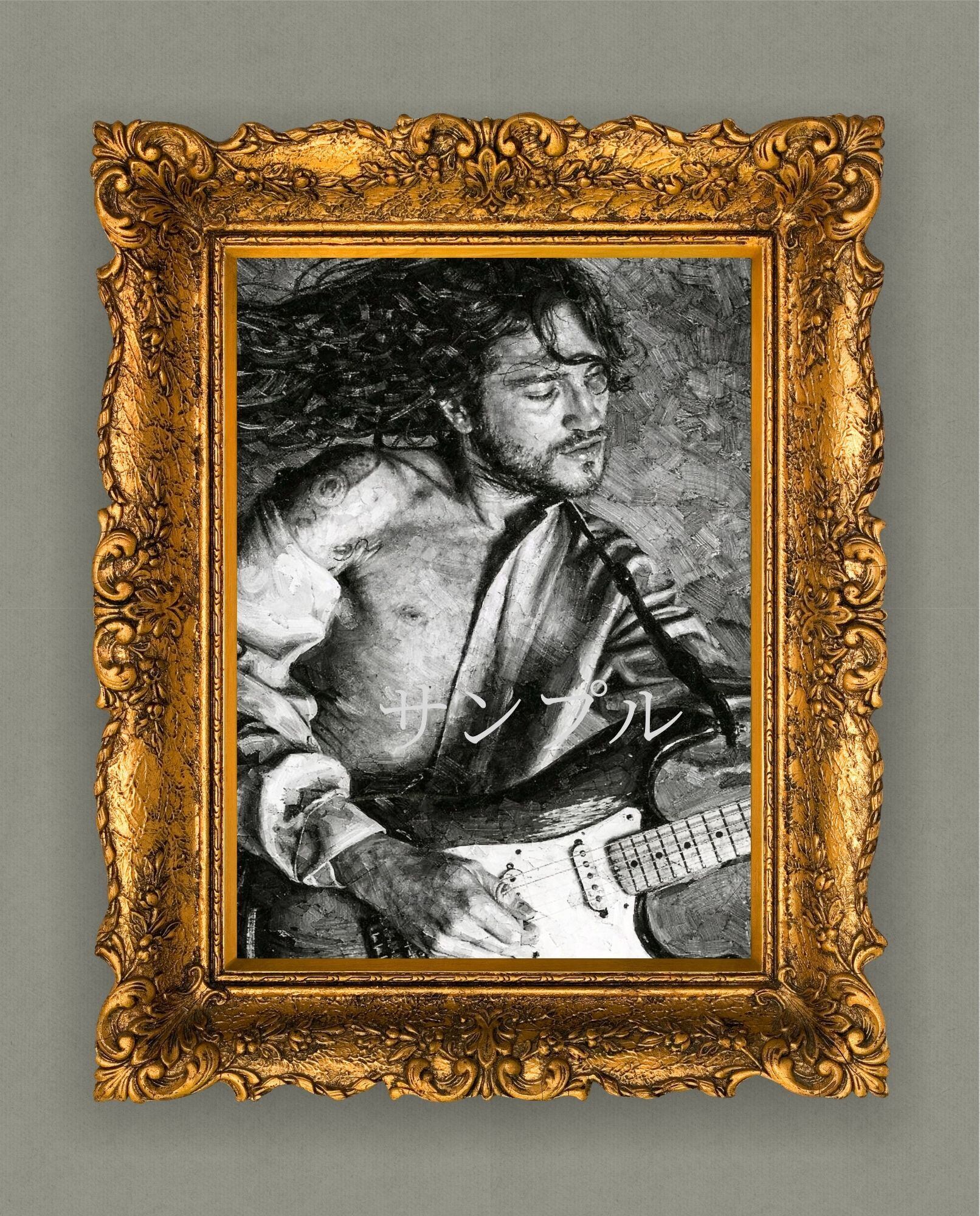 ロックギターの本質とも言える“感情”を、モノクロ油絵風の重厚なタッチで描き出しています。