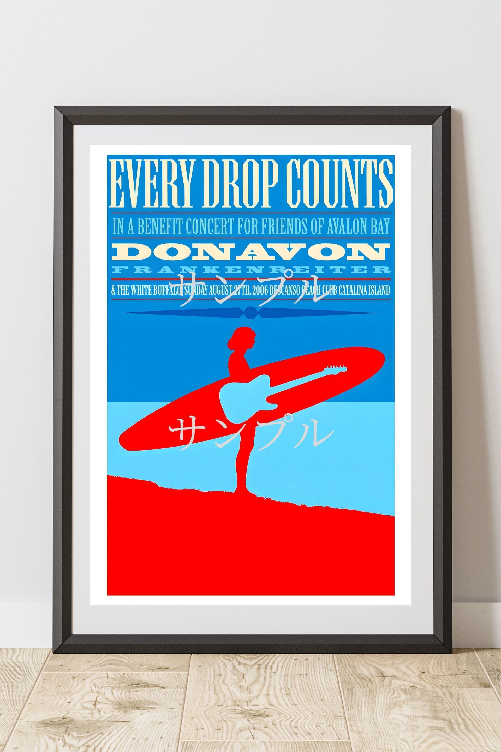 「EVERY DROP COUNTS」のメッセージと、アヴァロンベイでのベネフィットライブをモチーフに構成されたデザイン。