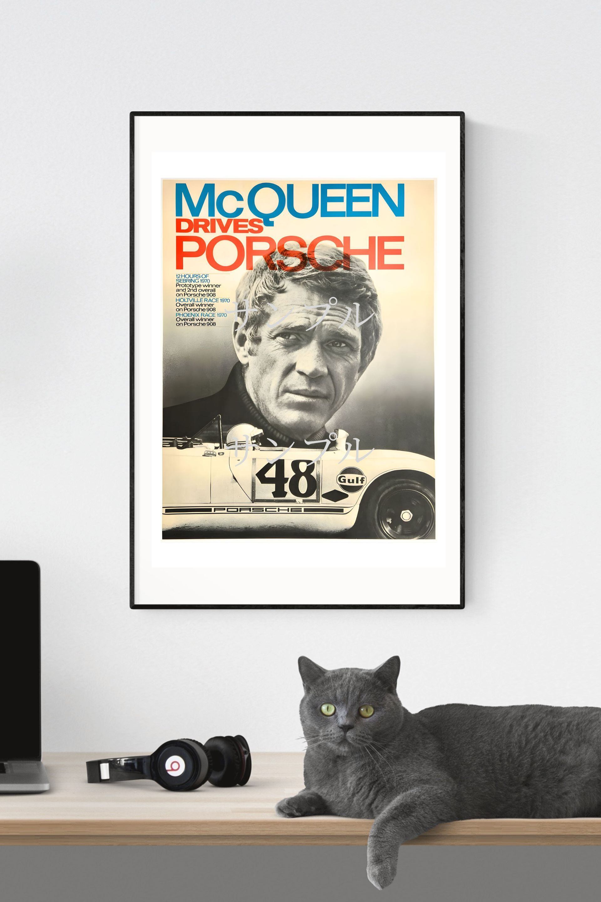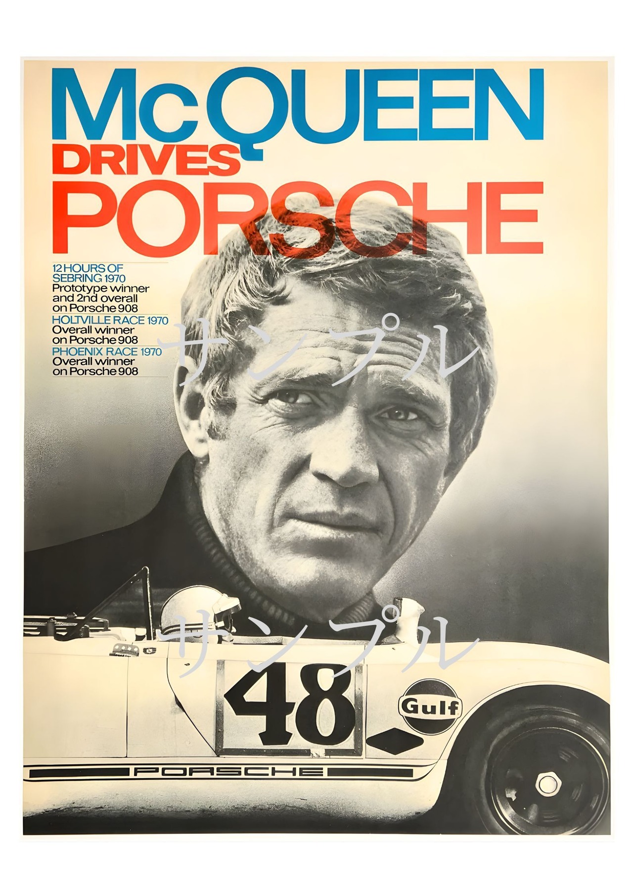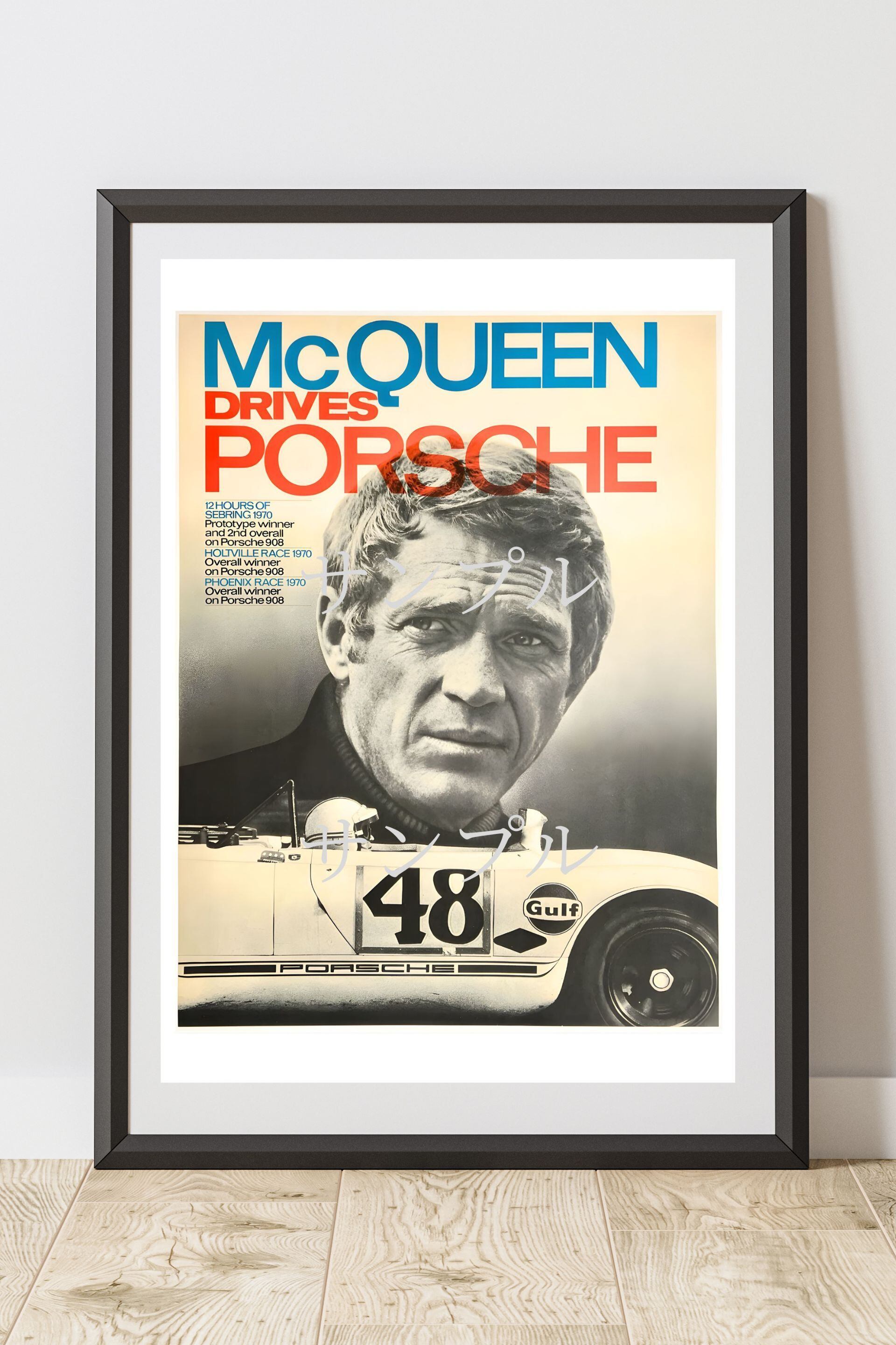 ゼッケン48のポルシェ908、Gulfロゴ、そしてマックイーンのポートレートが融合した、圧倒的存在感のデザイン。