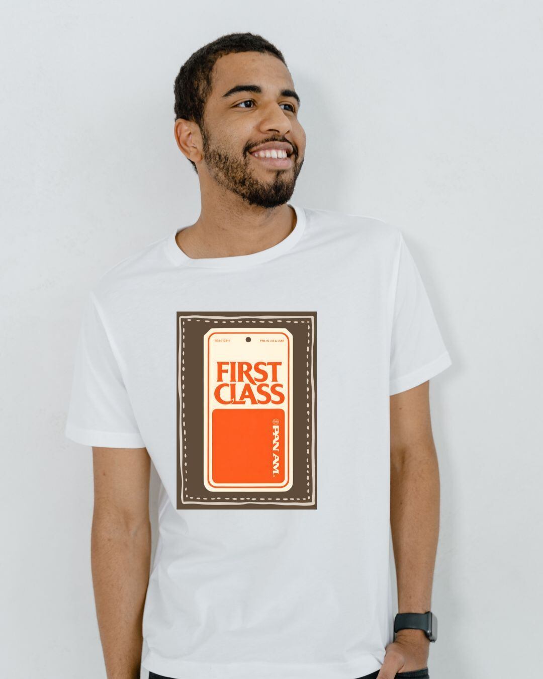 クラシックな航空タグのデザインと「FIRST CLASS」の文字が融合し、