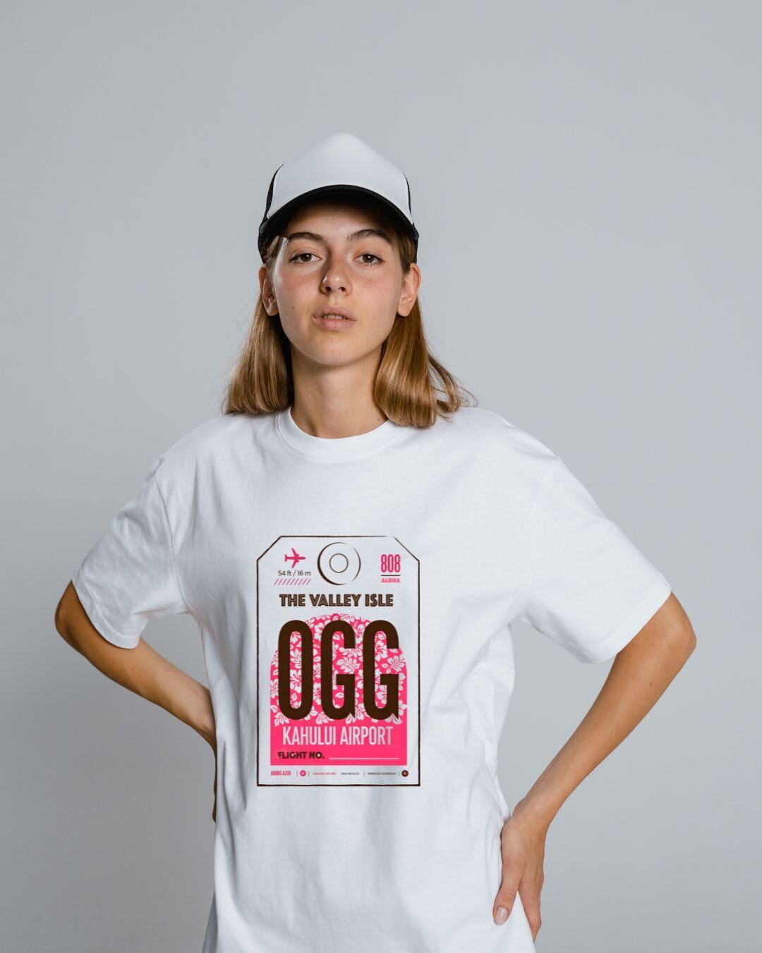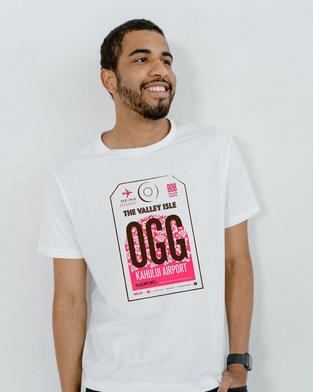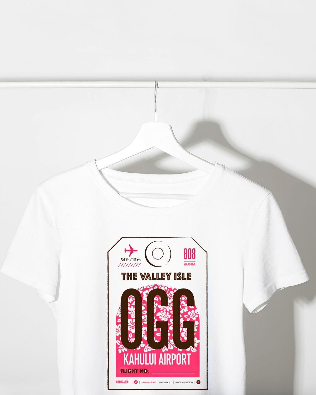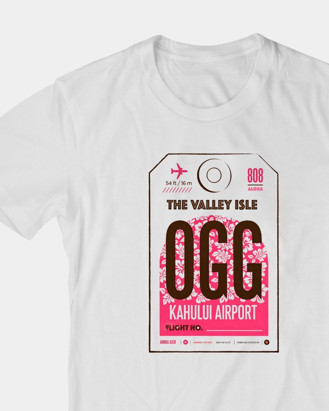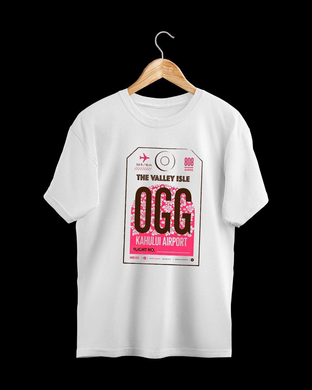 ハワイ・マウイ島「カフルイ空港(OGG)」をモチーフにした、タグ風グラフィックTシャツ。