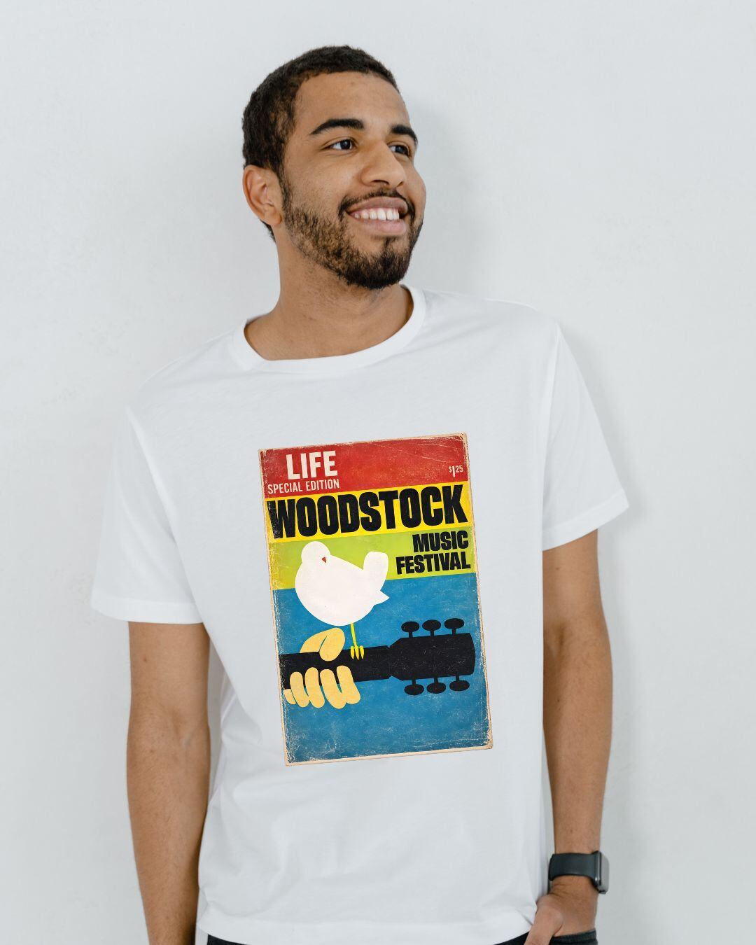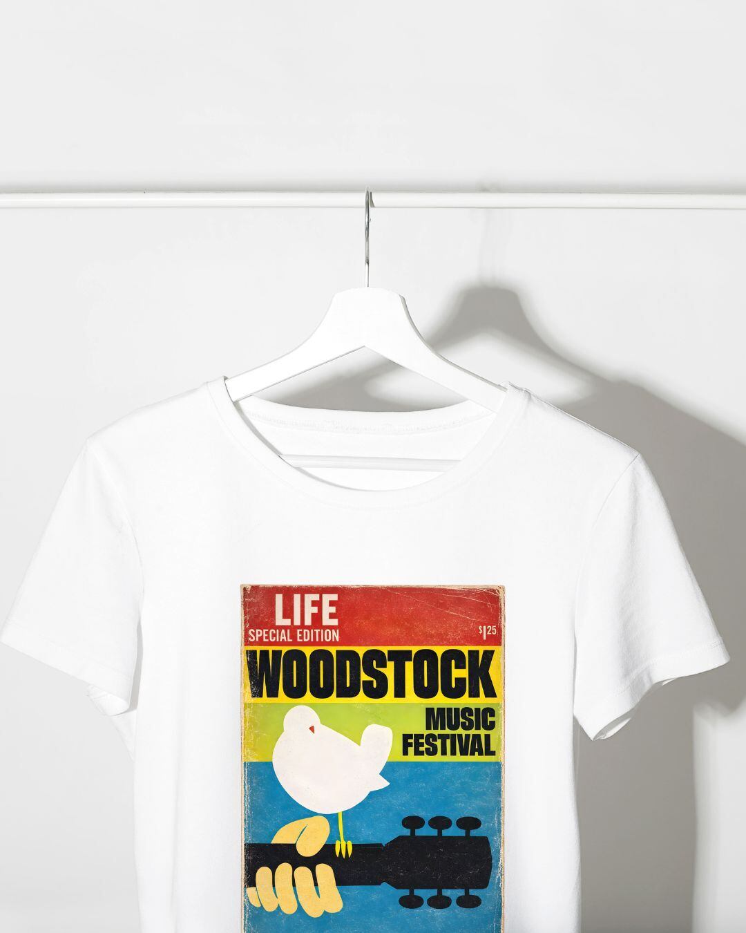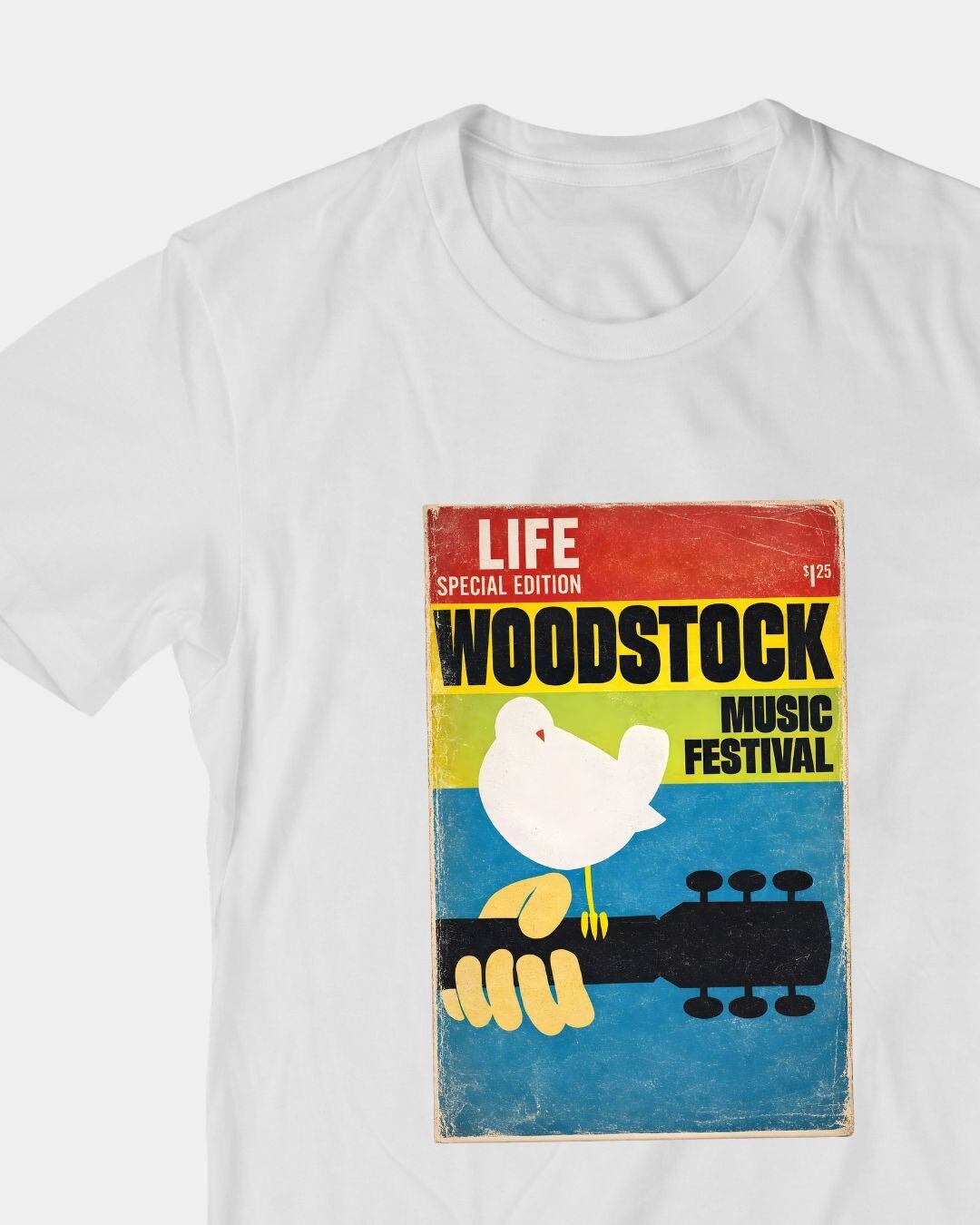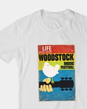 伝説的音楽フェス「WOODSTOCK」をモチーフにしたポスターを再構成したグラフィックTシャツ。