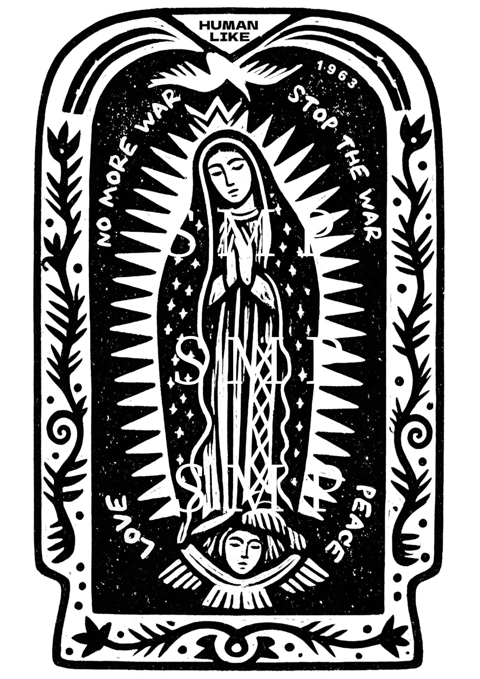中央に祈りを捧げる聖母像を配置し、放射状の光と星の装飾で神聖性を強調。周囲には反戦と愛、平和を訴えるタイポグラフィを配置し、視覚と思想の両面から強いインパクトを生み出しています。