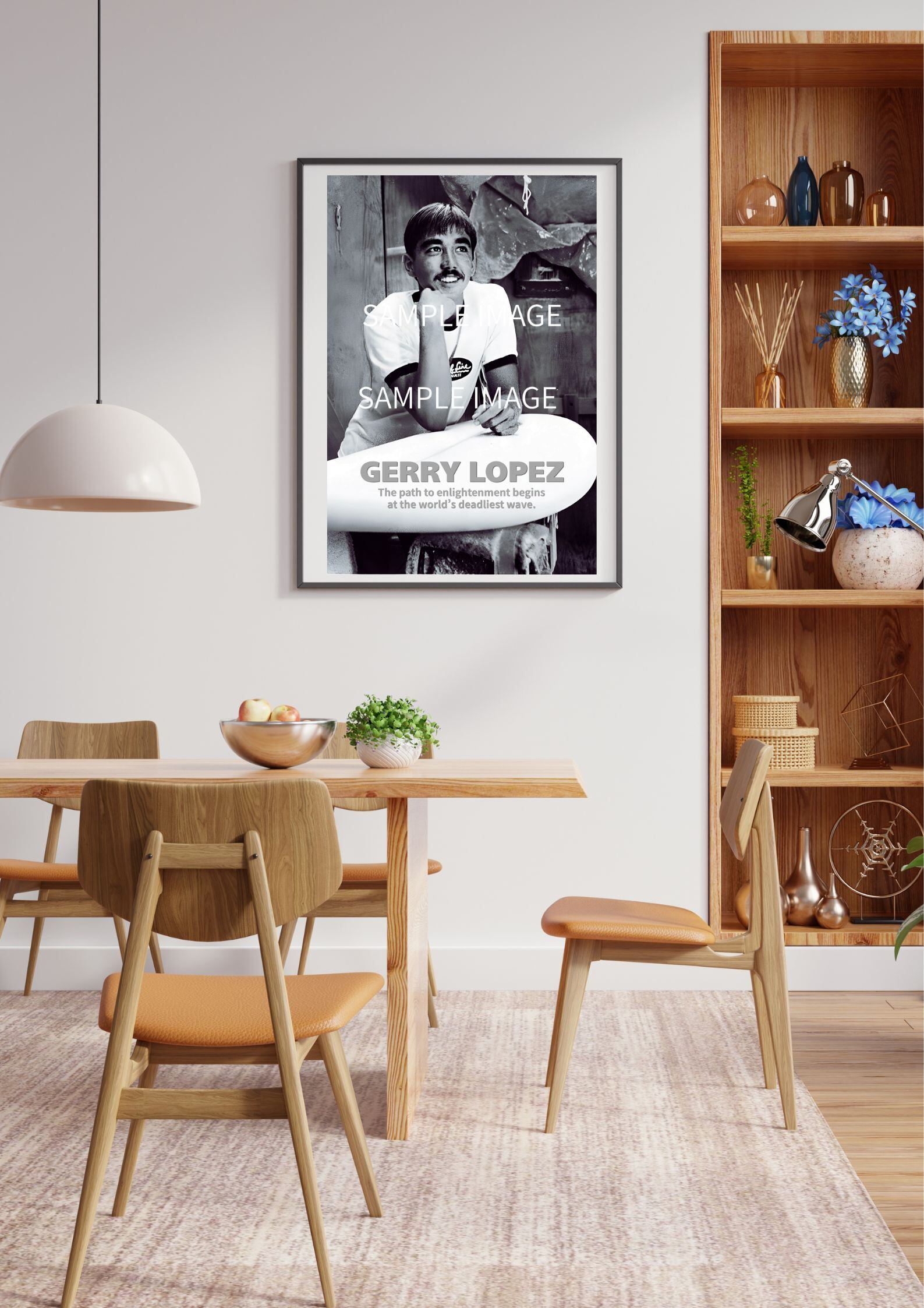 若き日のジェリー・ロペスをシェイピングルームで捉えた希少なヴィンテージフォトを、レプリカポスター化しました。