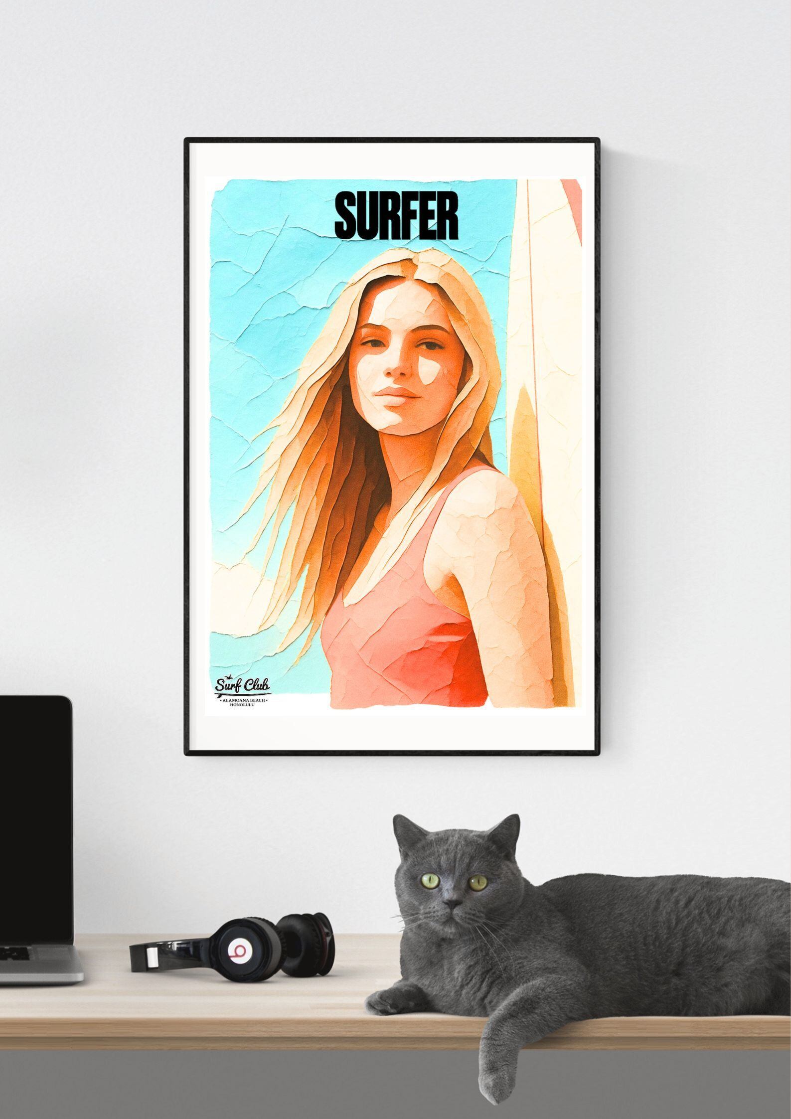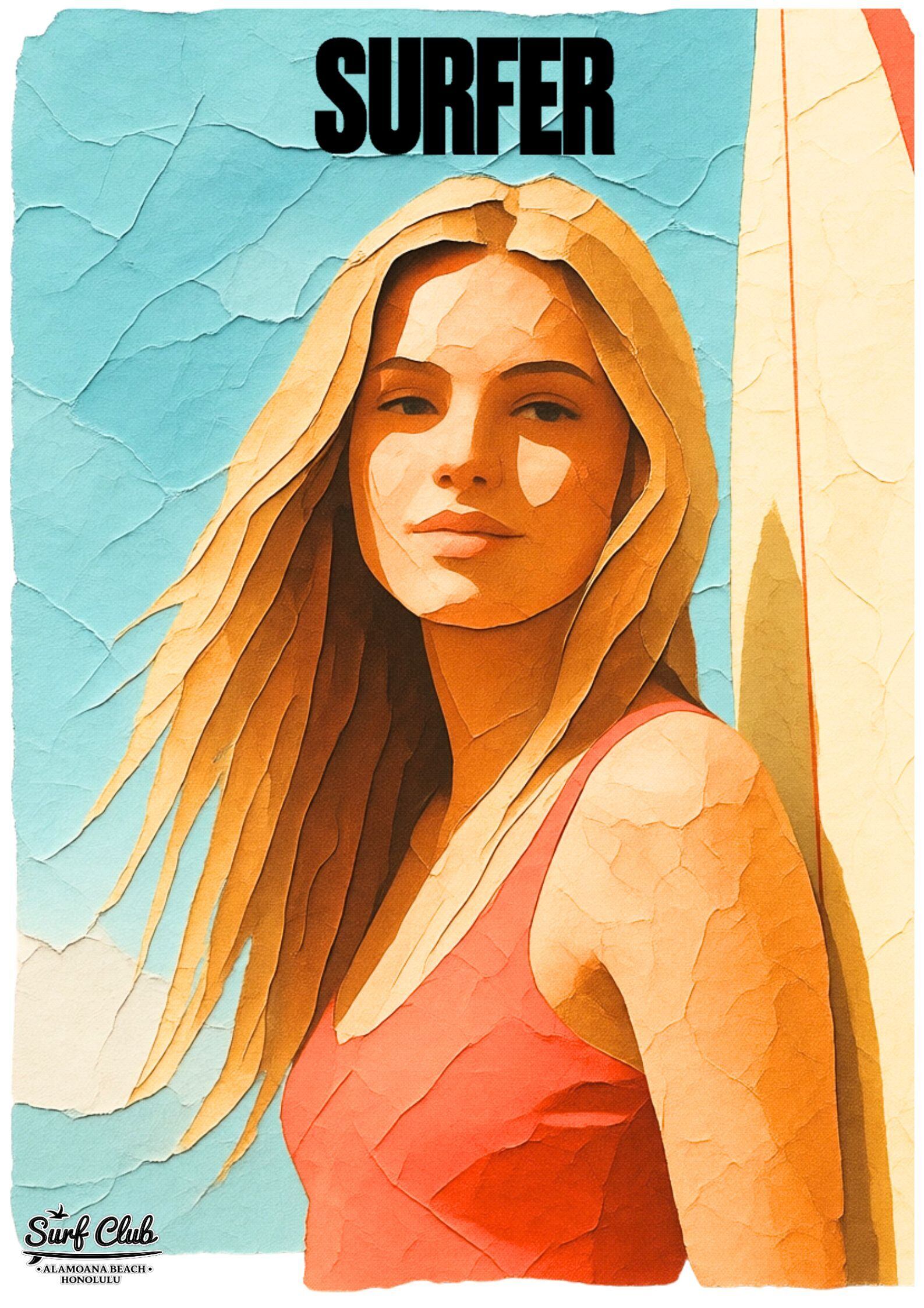 #サーフガール #SURFER #ハワイポスター #アラモアナビーチ #ホノルル #サーフアート #切り絵アート #ヴィンテージポスター #インテリアアート #壁掛けアート #A2ポスター #西海岸インテリア