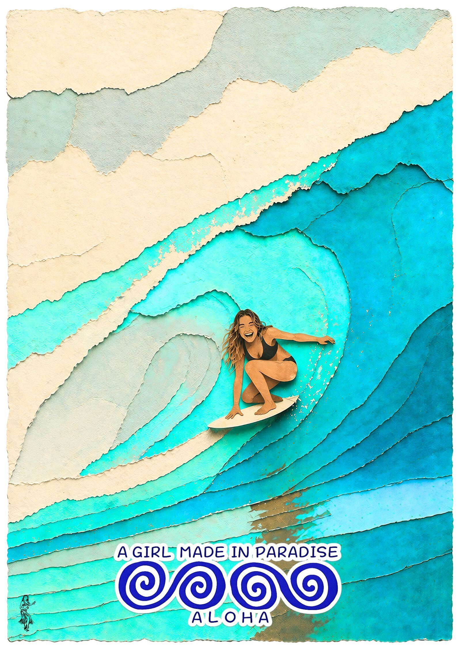 サーフィンアート, 波アート, 切り絵アート, ペーパーカット, サーフポスター, ハワイアン, ALOHA, インテリアポスター, ウォールアート, A2ポスター, 海アート, 女性サーファー, ヴィンテージポスター