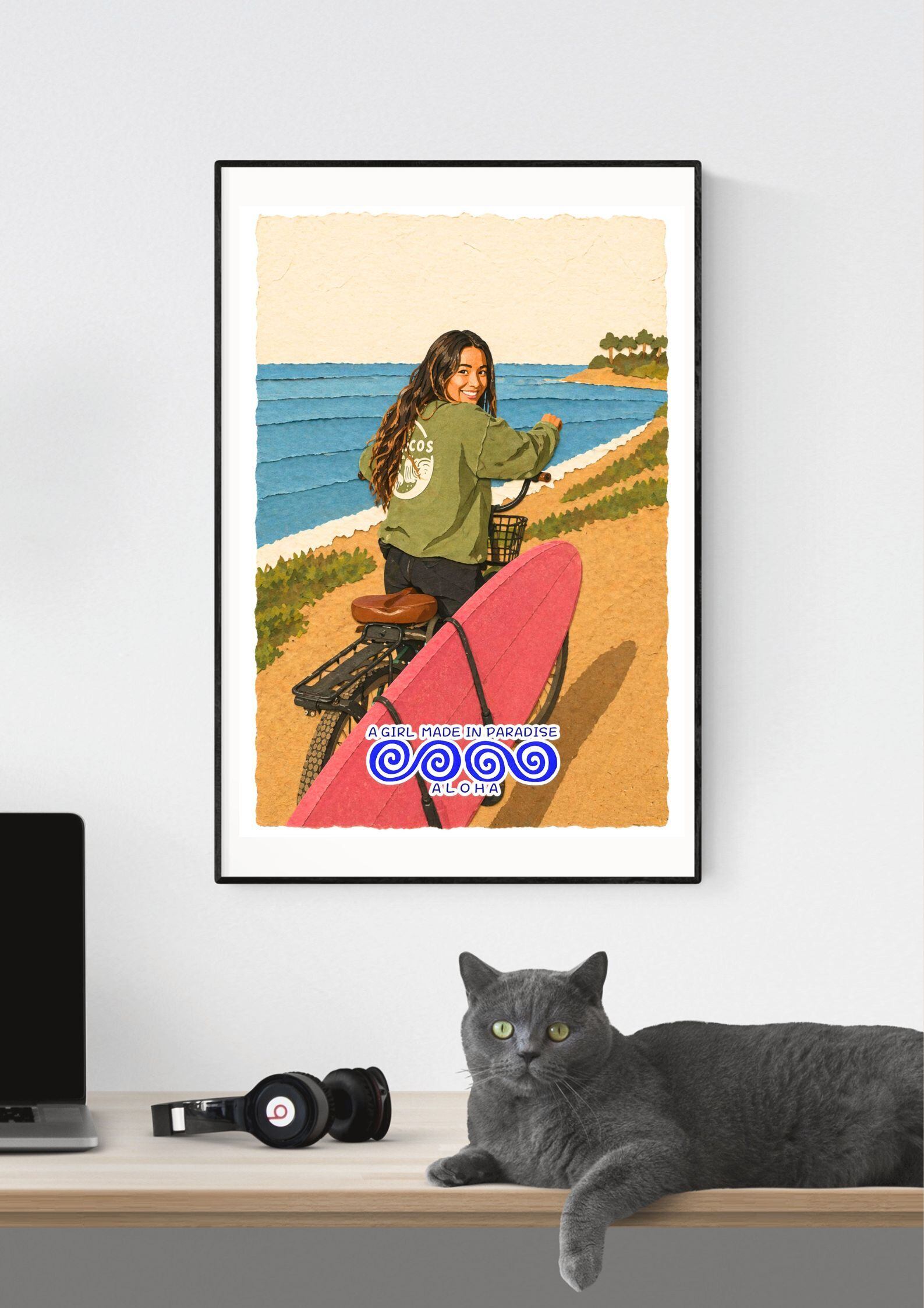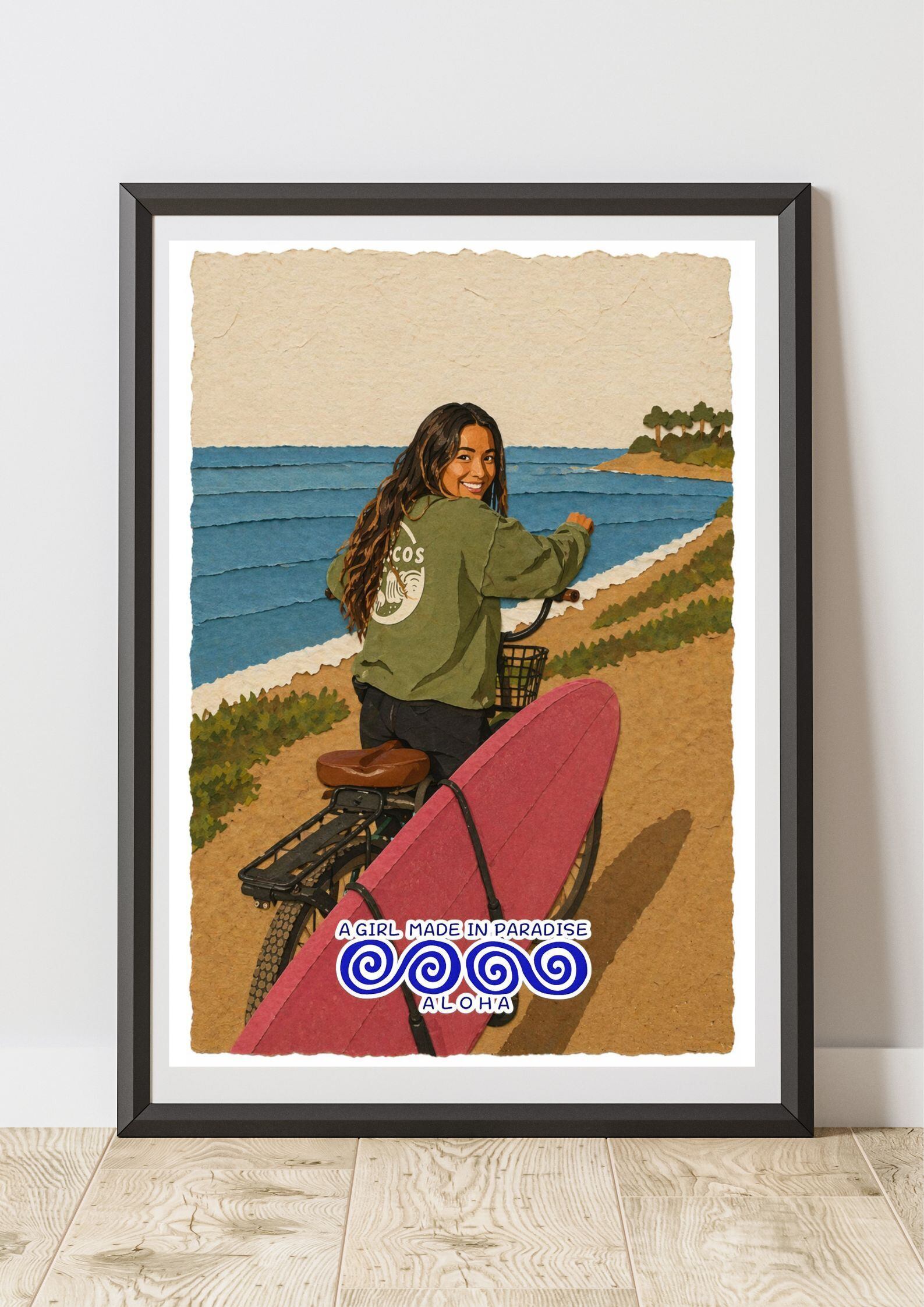 サーフアート, ビーチアート, 切り絵アート, ペーパーカット, サーフポスター, ALOHA, インテリアポスター, ウォールアート, A2ポスター, 女性サーファー, ビーチライフ, 海アート