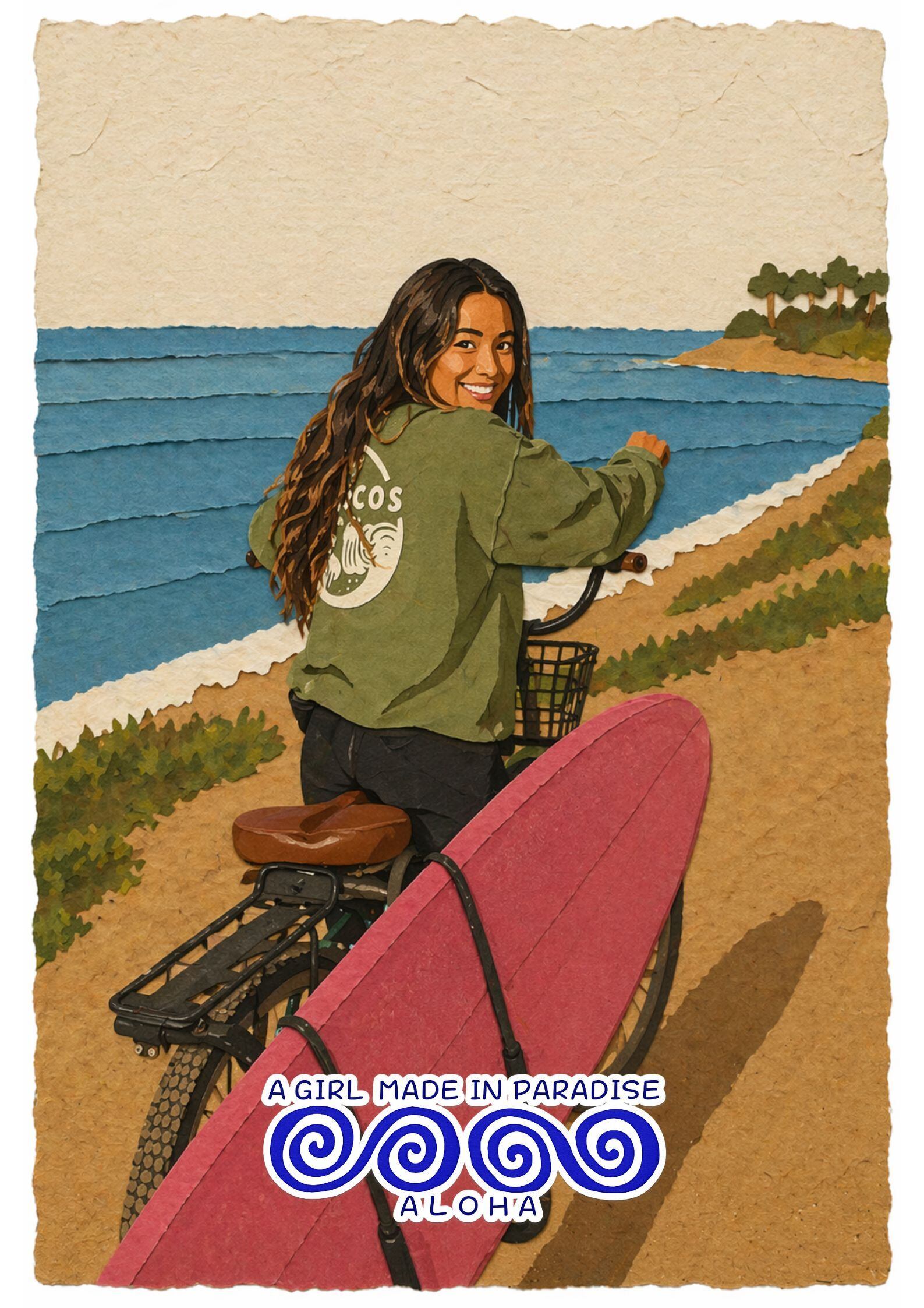 下部の「A GIRL MADE IN PARADISE」「ALOHA」がテーマを補強。