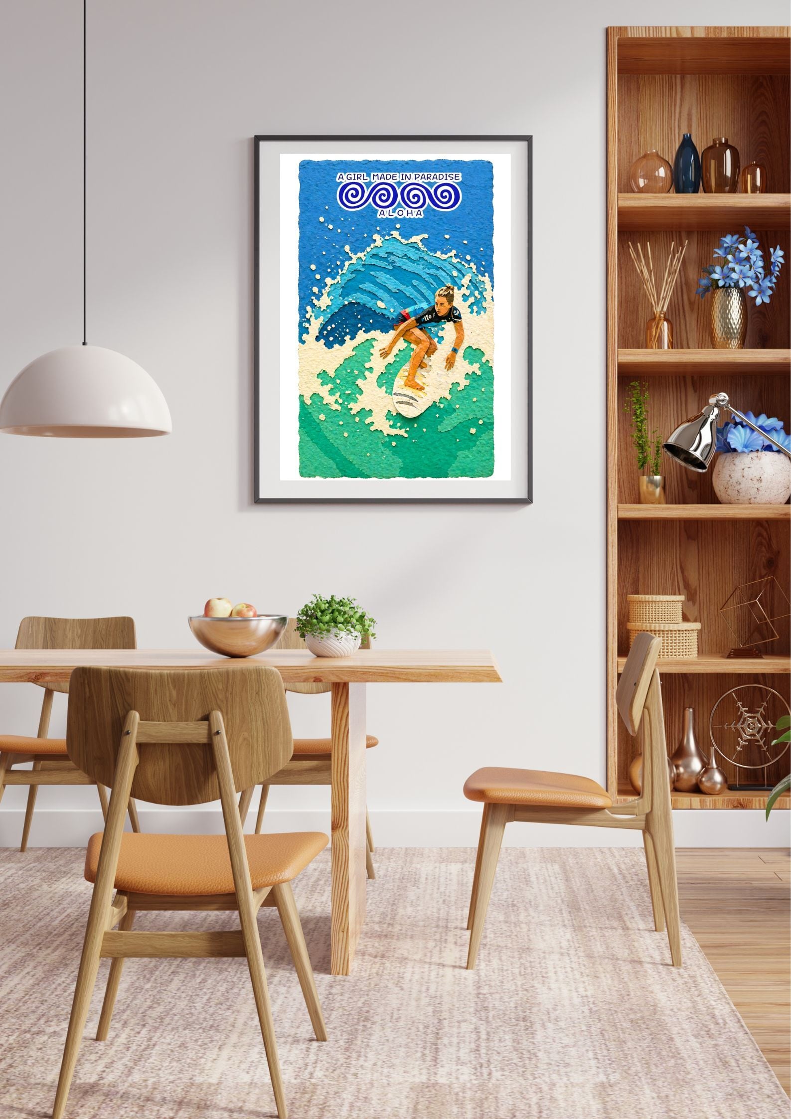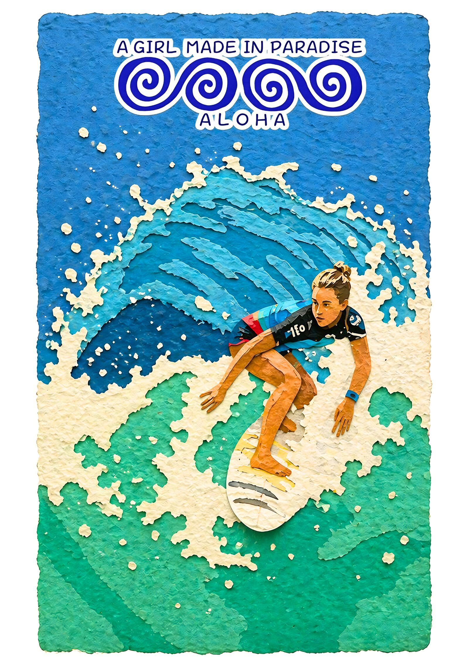 サーフアートポスター A2|女性サーファー・トップターン・波・ALOHA|切り絵レイヤー構造インテリアアート