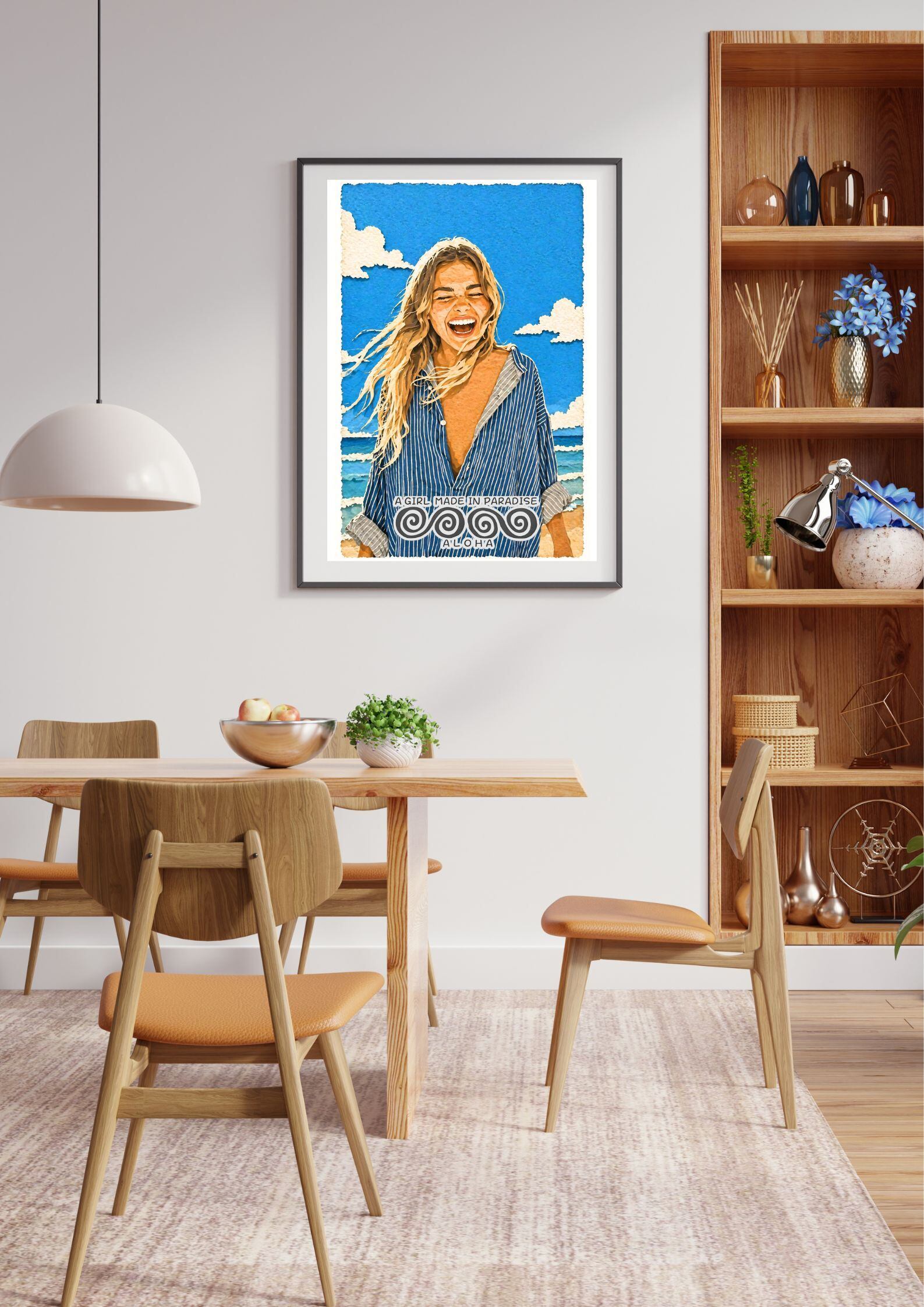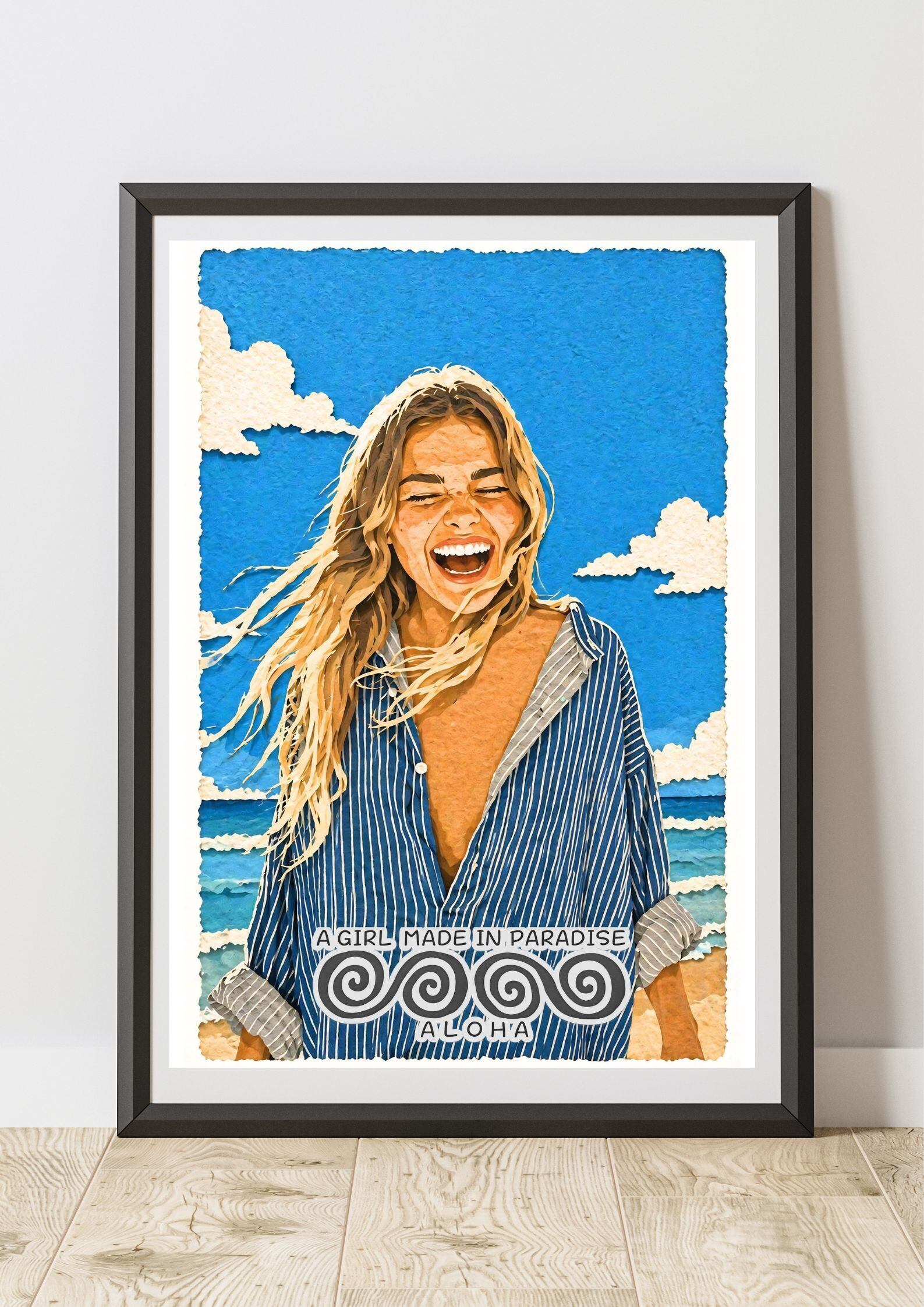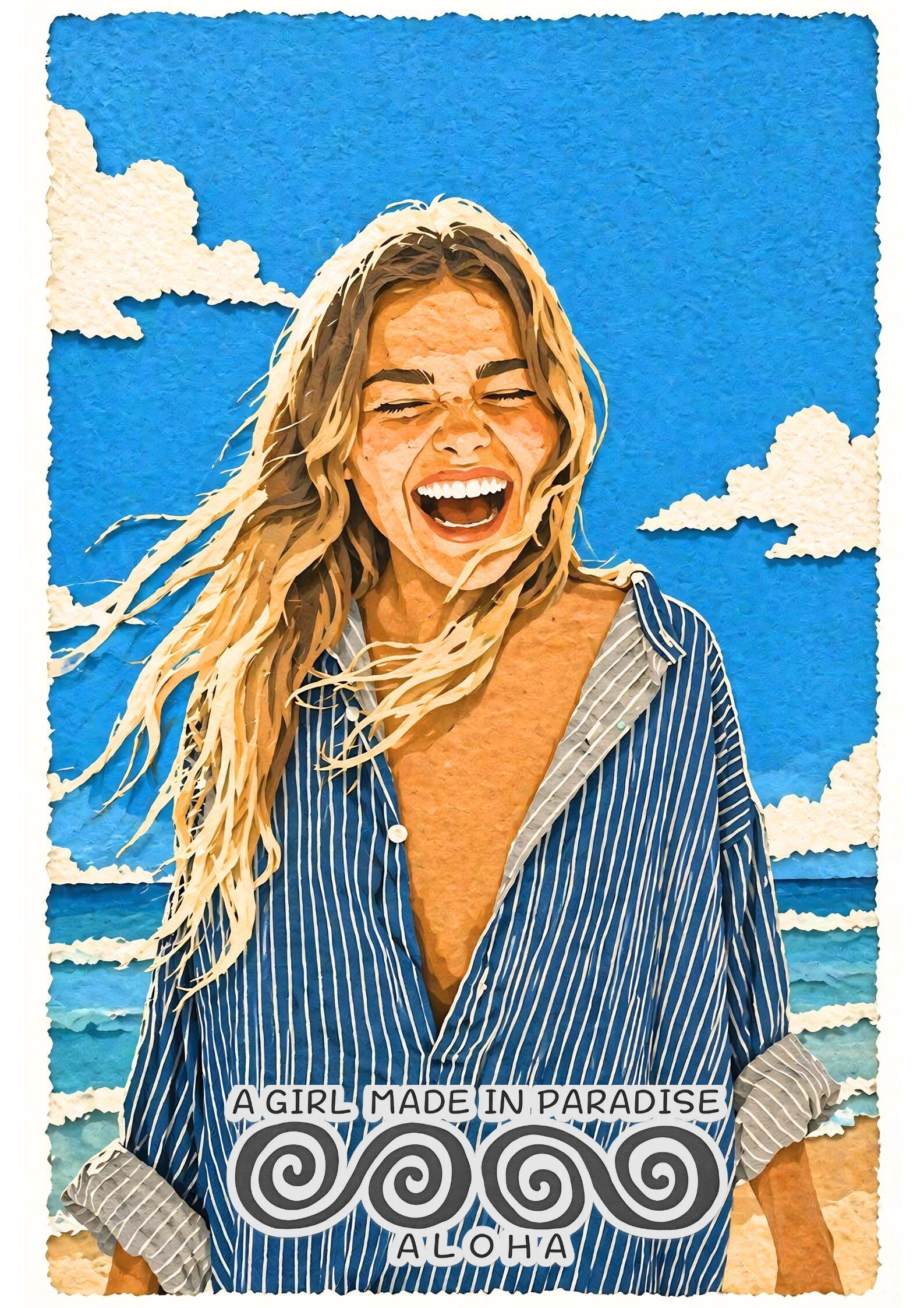 サーフアートポスター A2|女性ポートレート・ビーチ・笑顔・ALOHA|切り絵レイヤー構造インテリアアート