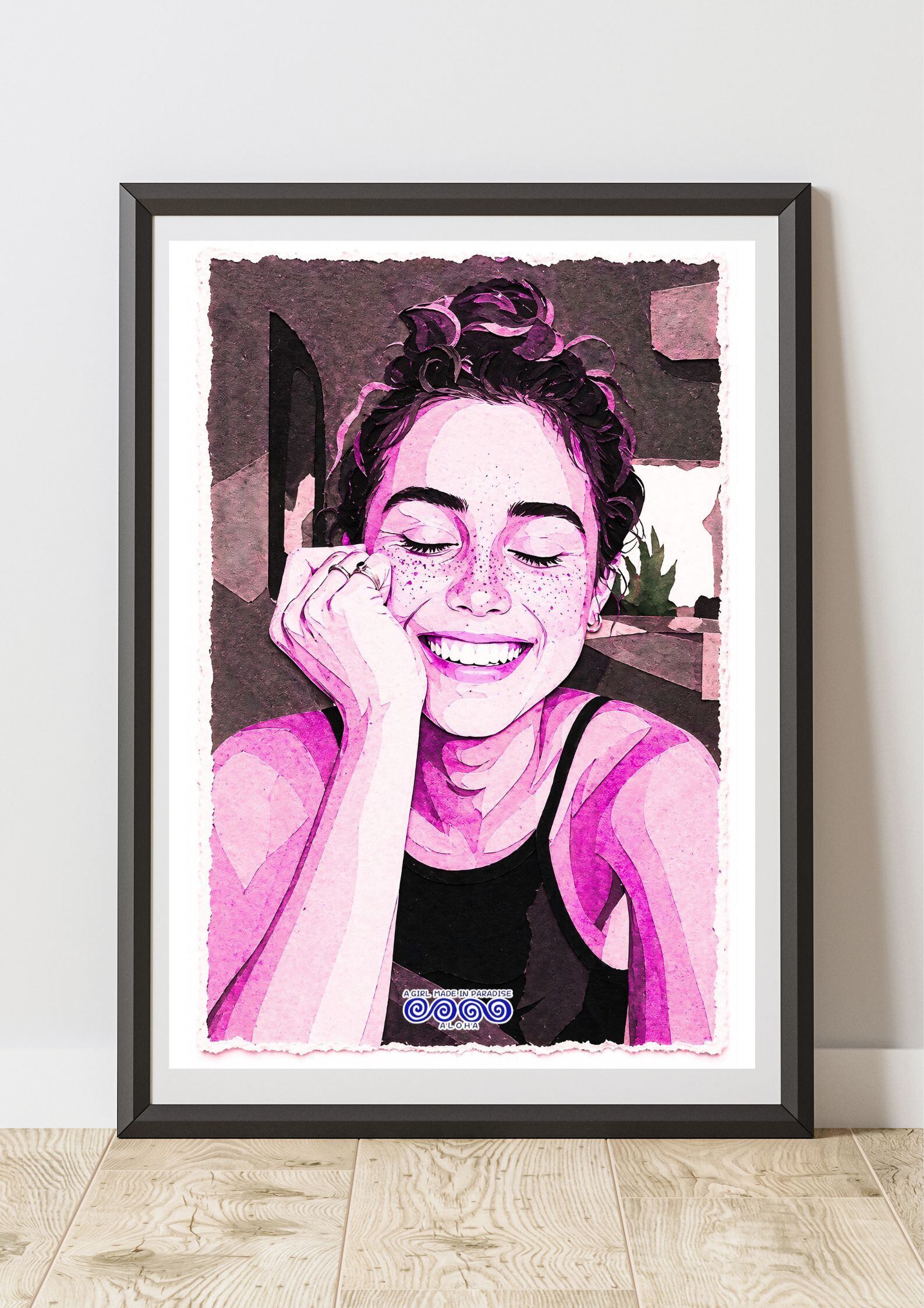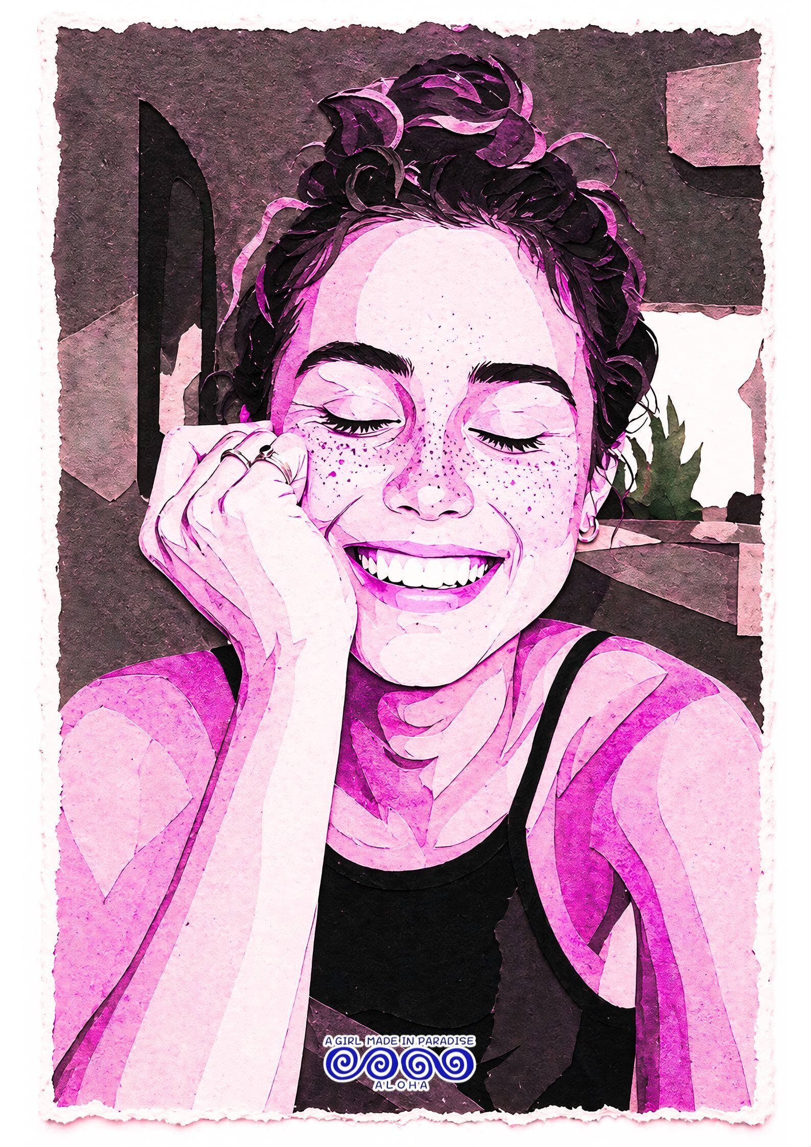 アートポスター, ポートレート, 女性アート, スマイル, 切り絵アート, ペーパーカット, ピンクアート, インテリアポスター, ウォールアート, ALOHA, A2ポスター