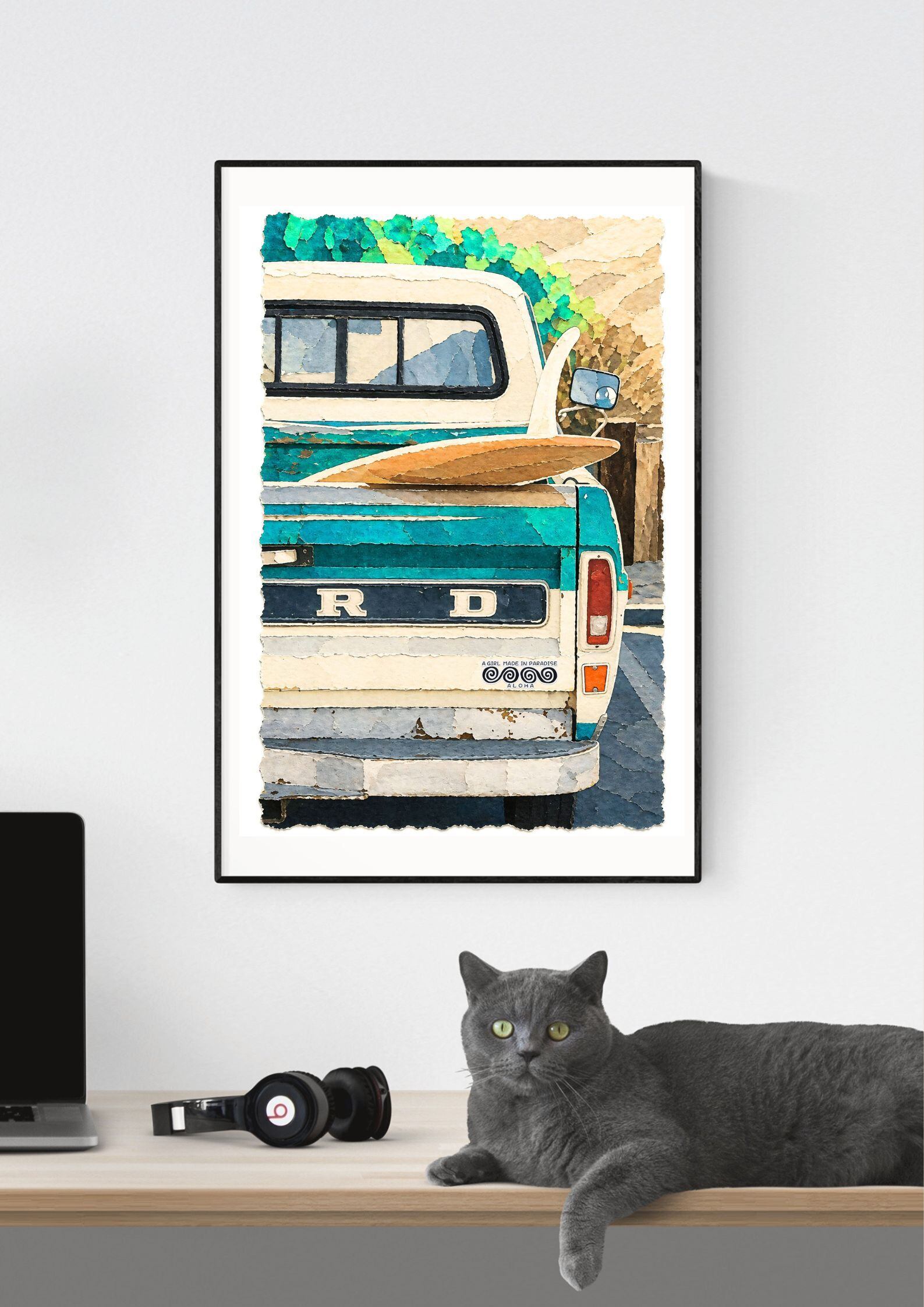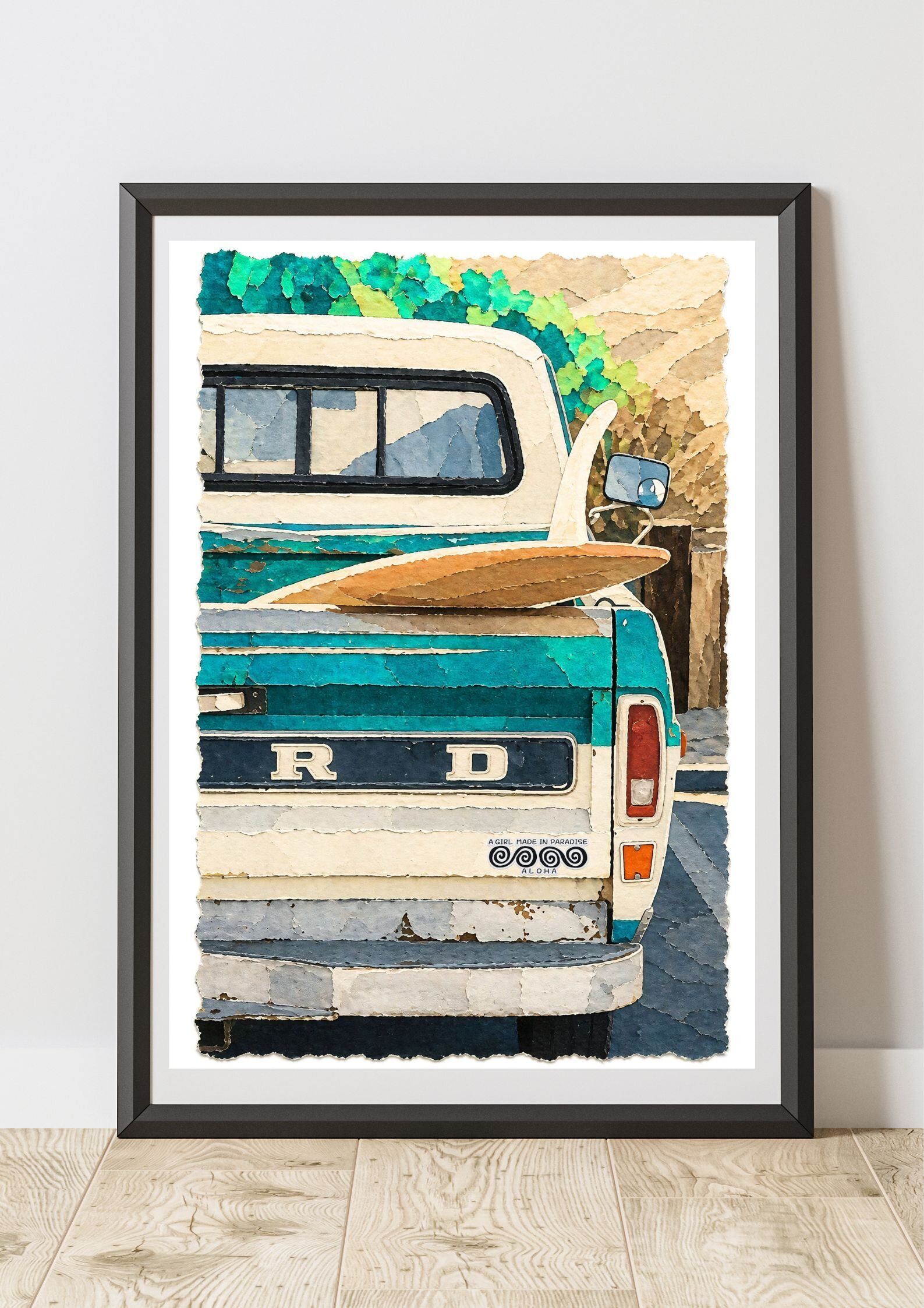 切り絵サーフアート「サーフガールとクラシックカー」A2ポスター|ハワイアン・ビーチ・ヴィンテージ・インテリア装飾