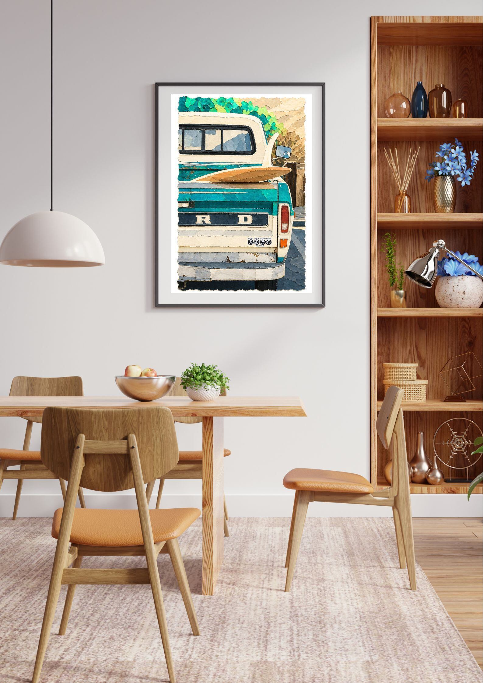 ヴィンテージ、サーフ、アメリカンカルチャーを軸に、空間の印象を一段引き上げるアートです。