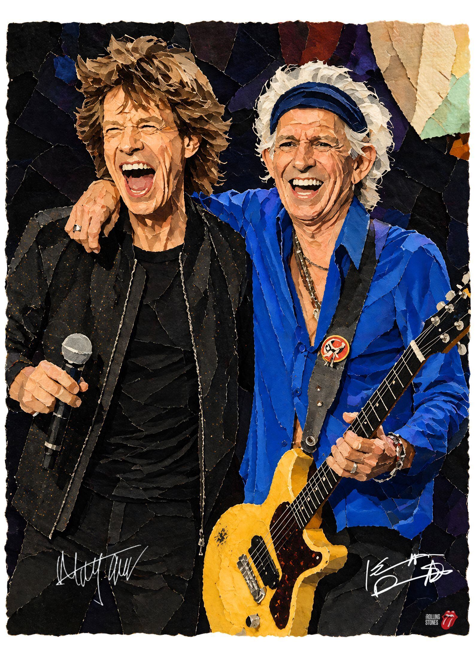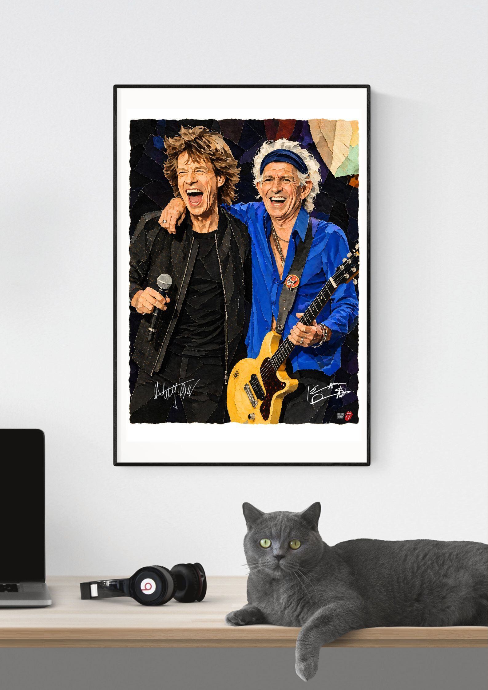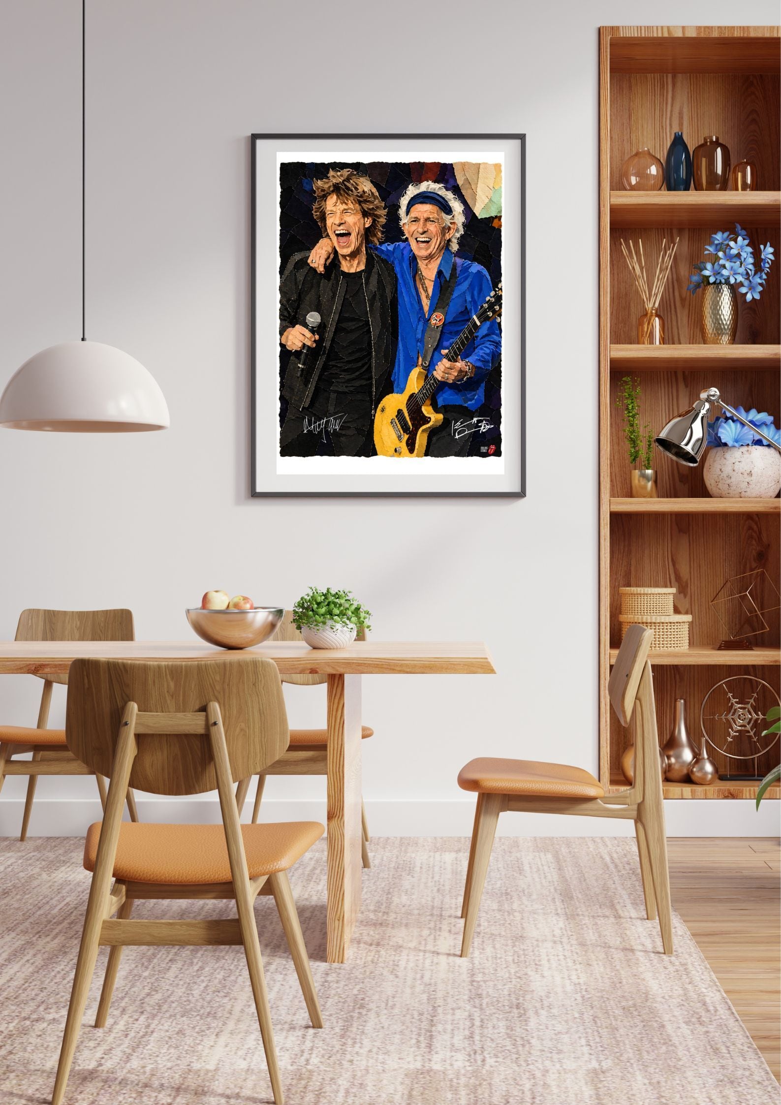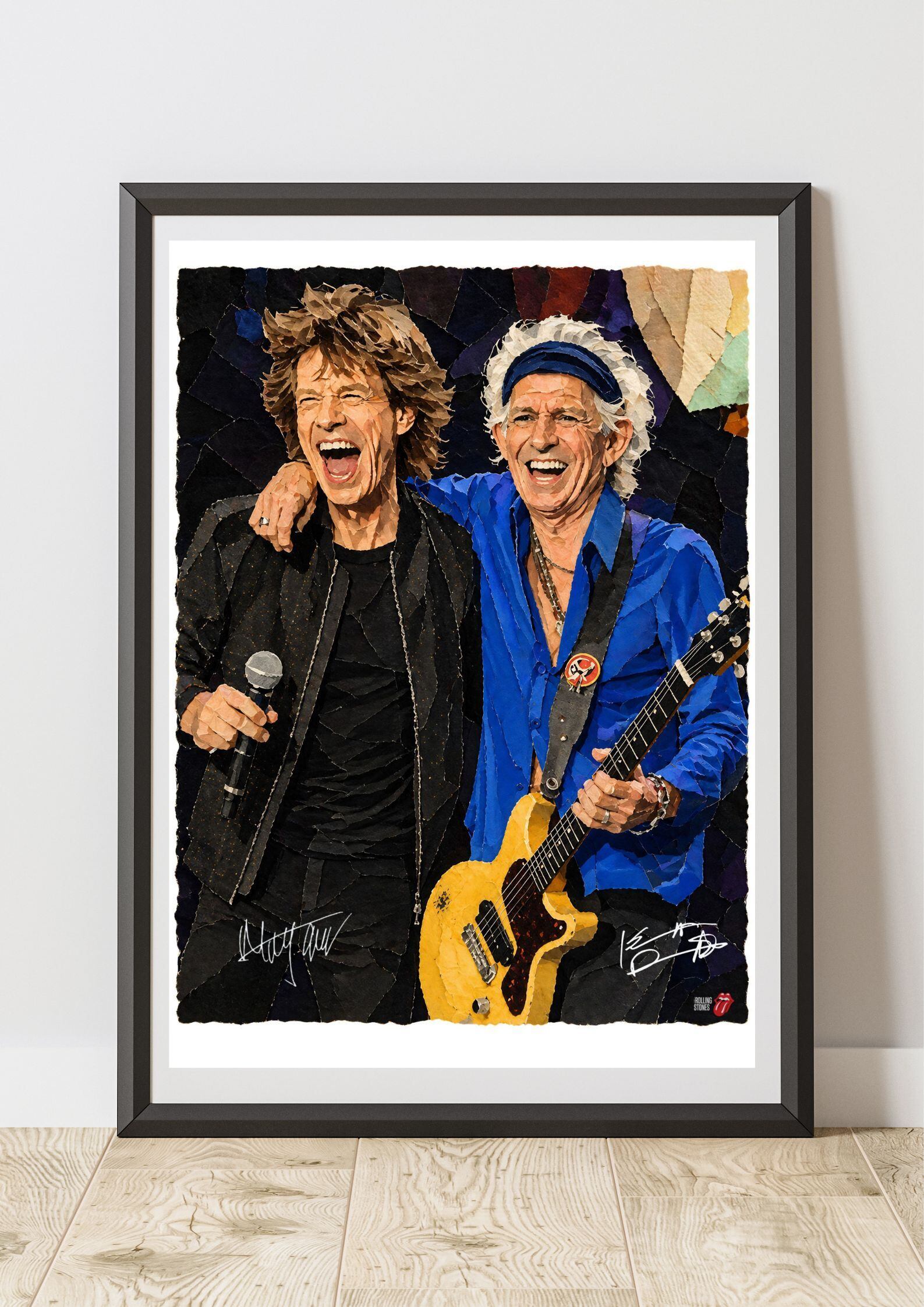 ミック・ジャガーとキース・リチャーズを想起させる二人の関係性をモチーフに、ライブの高揚感と一体感を切り絵で表現したレプリカアートポスター。紙の質感とヴィンテージ加工により、視覚的な熱量とグルーヴを再現しています。飾ることで空間に躍動感が生まれ、音楽のある空間へと引き上げます。